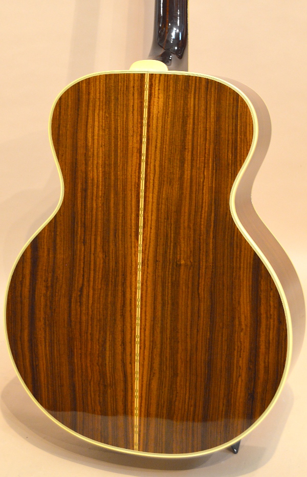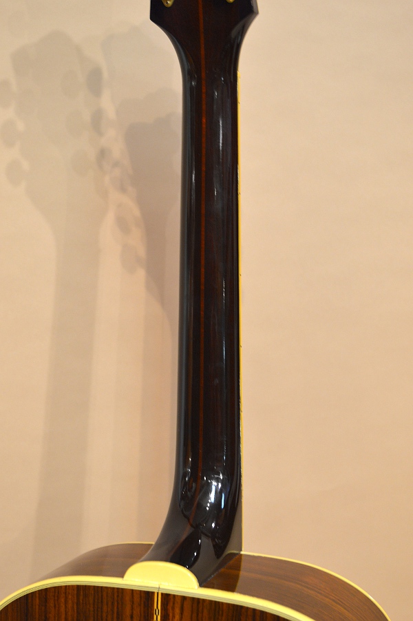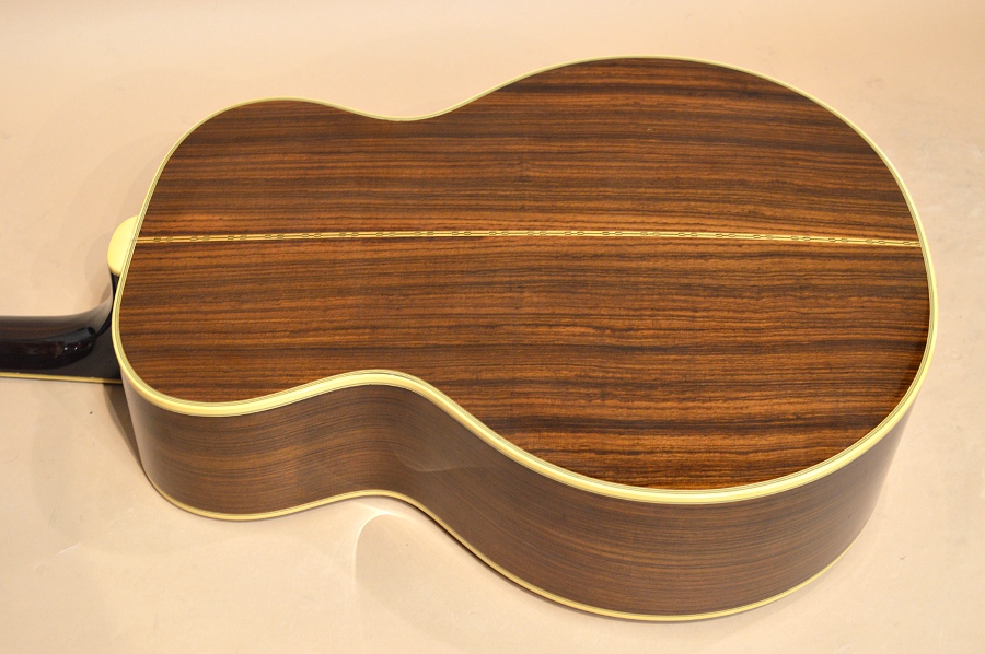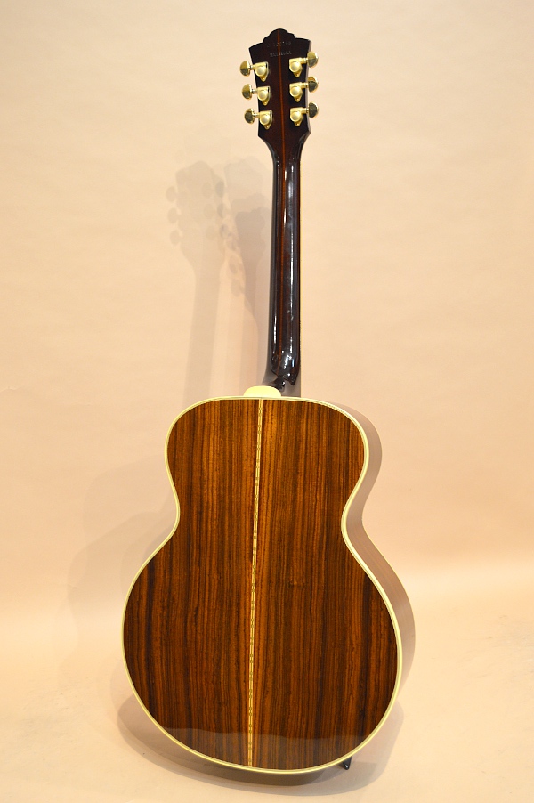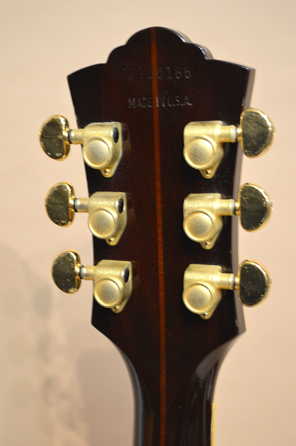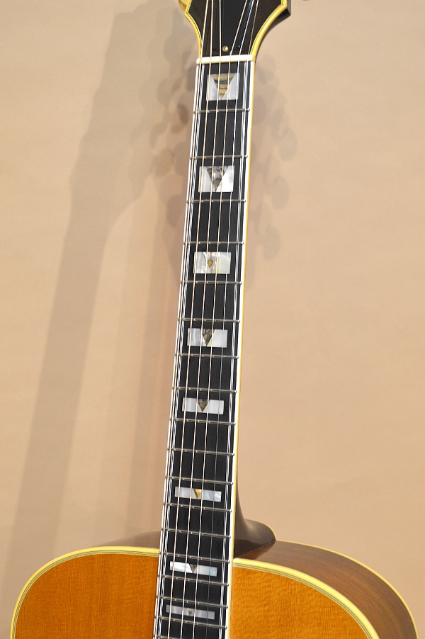 ソリッド・スプルースTOP、ソリッド・ローズウッドSIDE&BACK、マホガニーNECK、エボニー指板&ブリッジ、トラディショナル・ギルド・スキャロップ・ブレーシング、実測44.5mmナット、25.5インチ・スケールの16インチ・スモール・ジャンボ。このGFシリーズは1987年~93年まで、トラディショナル・シリーズとして発売されていたモデルで、ポール・サイモンやジョー・ウォルシュらの至高のパートナーであったF-30RNTの流れを汲むシリーズとして人気を博しました!92~93年に限定生産されたF-30Rポール・サイモン・モデルも同じ16インチ・スモール・ジャンボでしたので、考えようによってはポール・サイモン・モデルのデラックス・バージョンとも言えますね(笑)。ブロック・パール&トライアングル・アバロン・ポジション・マークが最上位機種に相応しい貫禄を感じさせます!因みに94年のフェンダー社買収後、色んなモデル変更がありこのGFシリーズも姿を消してしまいますが、、ビンテージ・ギターのバイブル、グルーン・ビンテージ・ガイド・ブックに因ると、今回入荷の個体がGF-55の最終シリアルのようです。