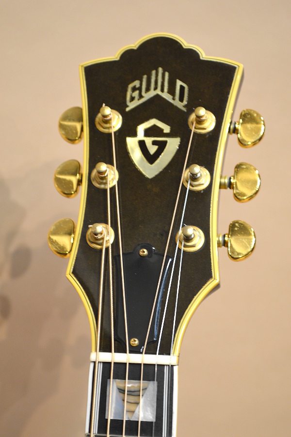 楽器のコンディションは年式から考えるとキズの類も少なく、全体的にはかなりの美品コンディションですが、ボディーのセル・バインディングが剥がれ、接着修理されています。ギルドのセル・バインディングって分厚くてかなり強固なバインディングの為、再接着された箇所はマーチンなどのセル剥がれ修理よりは少し目立ちますが、しっかり接着されていますので、今後長く使う分には安心かと思います。バックのバインディングは長さが足りなくなった影響で、ネックヒール部下の両サイドに1mm弱のセルの継ぎ足しがあります。また、ネックのバインディングの1弦側最終フレット付近と6弦側の9フレットのサイド・ポジの所でバインディングがピッと切れています。まあこれはギルド、、と言うかバインディング巻きのネックの宿命みたいなもんですね。その他は小さなポチキズやかすかな擦り傷が散見出来る程度で、全体的に見れば年式の割には相当綺麗なコンディションと言えるでしょう。