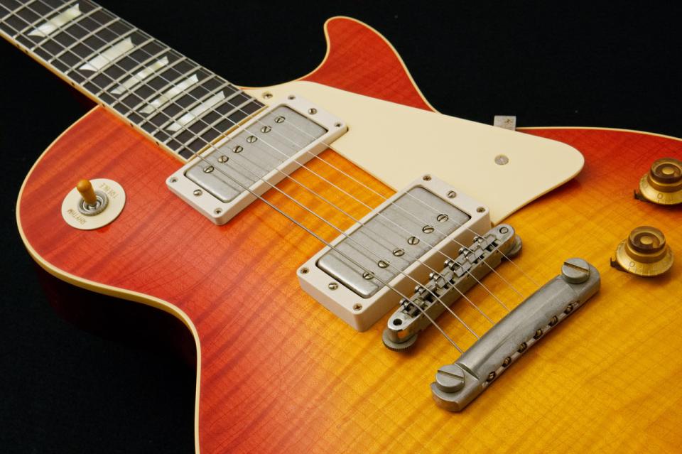 カラーはSunrise Tea Burstとなっており、2014年までのヒストリックコレクションでは人気の定番カラーでしたが、久々の登場となっております。外周部分のバーストが褐色化しオレンジ色への変化を再現しており、フレイムメイプルトップと相まって王道のバースト然とした佇まいを表現しております。