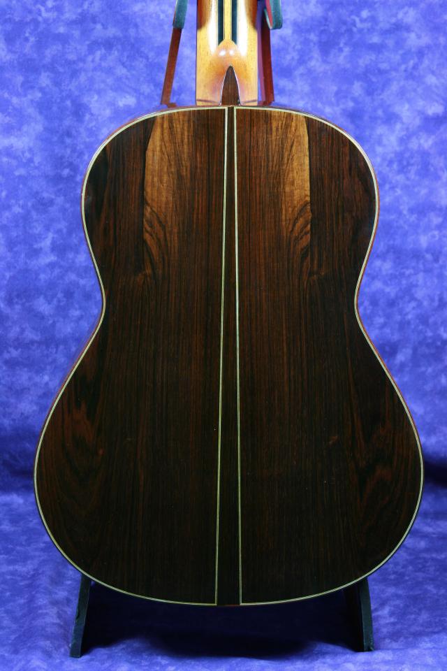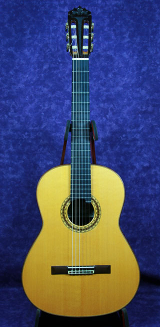 ネックは2本のエボニーの補強材が入ったセドロで、スペイン式一本棹方式でボディーと強固にジョイントされております。また、若干のレイズドフィンガーボードになっています。