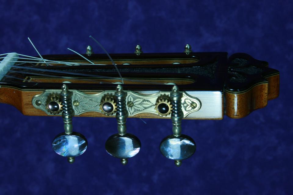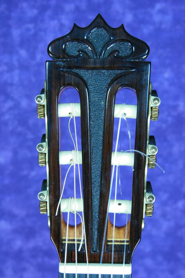 ブリッジはハカランダで、ヘッドの飾り板はハカランダで手の込んだ無し地彫りの装飾が施してあります。