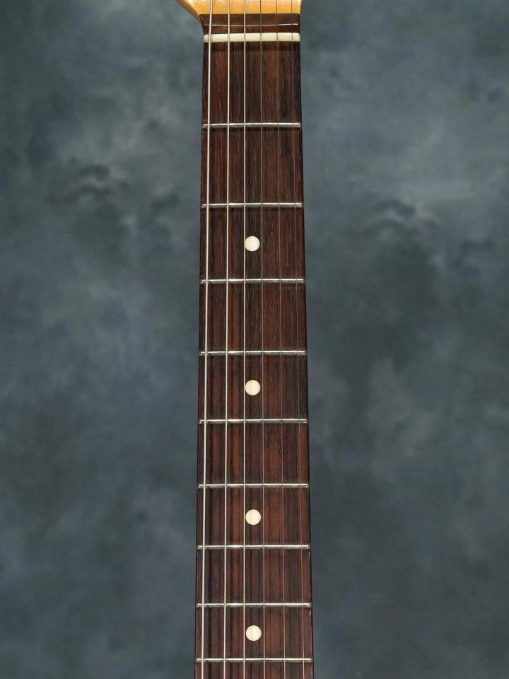ネック~ボディまで全体に隙間なく入ったウェザーチェックに加えて、各部の打痕や弾き傷などの使用感、ピックガードまでエイジングされた貫禄のルックスながら、指板はハイフレットのチョーキング時音詰まりを軽減する緩やかな10インチラディアスを採用する事で現代的な演奏性も考慮したプレイヤー向けの仕様。