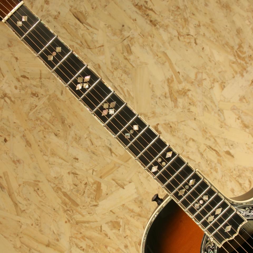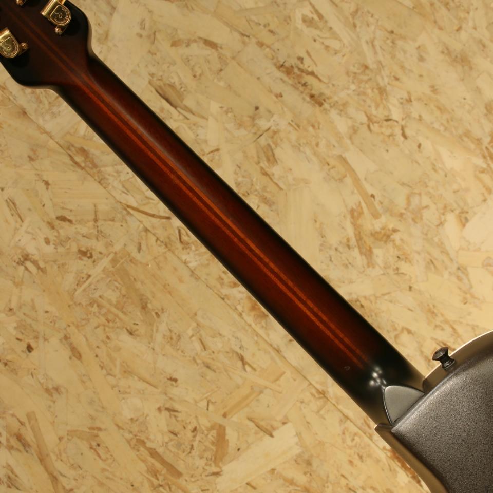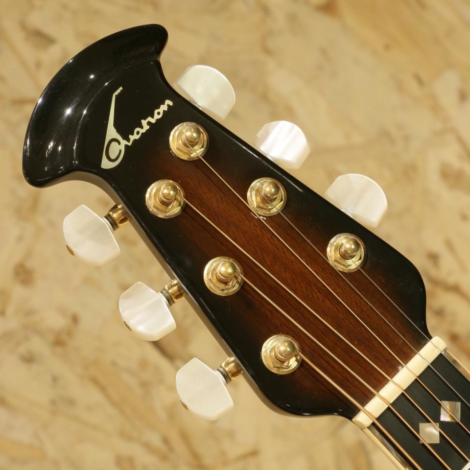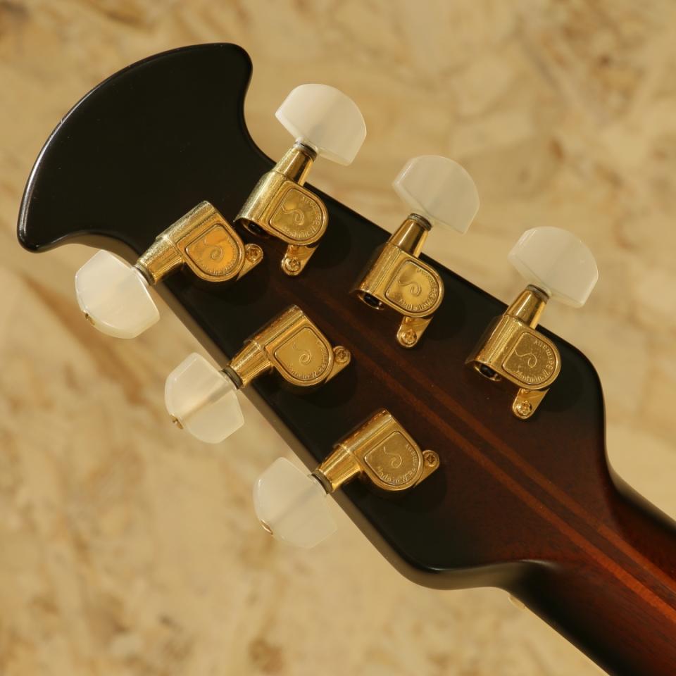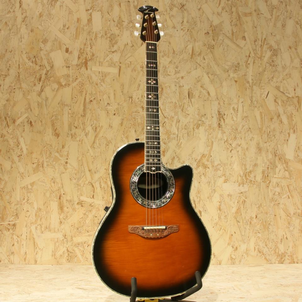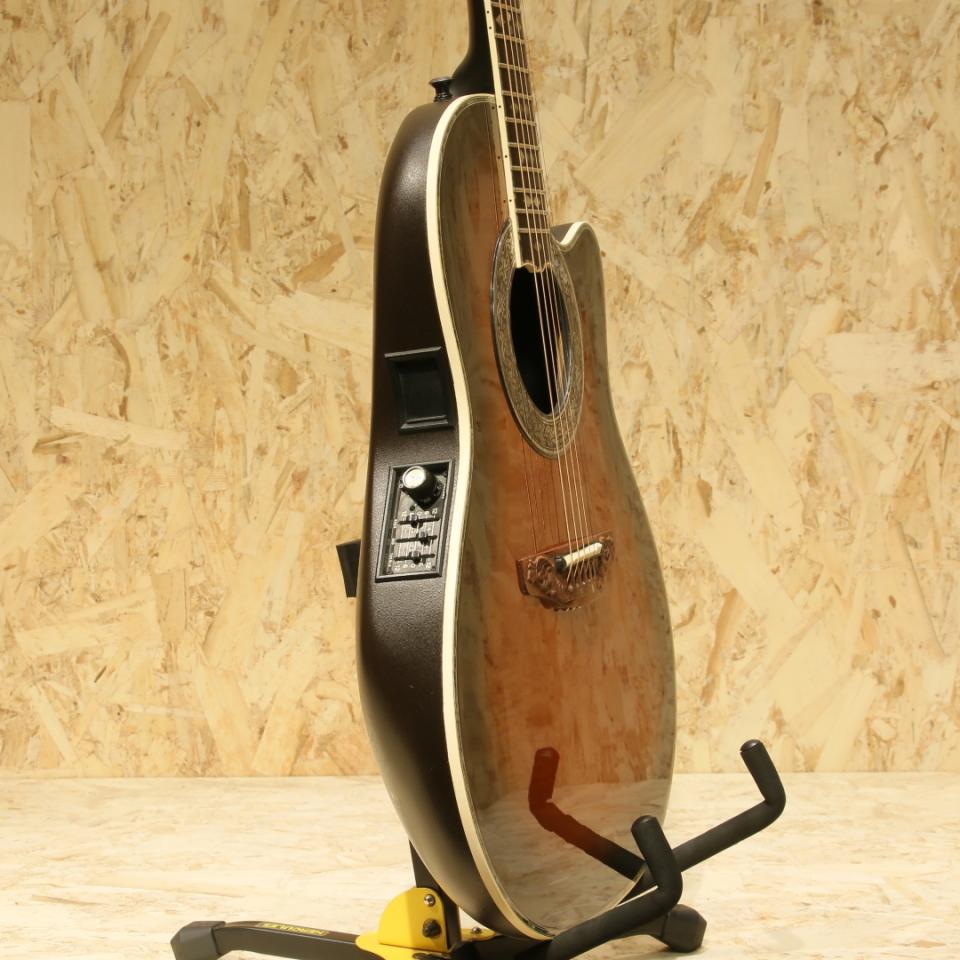 1966年、ヘリコプターの製造会社の社長であり、有名なギタリストでもあったチャールズ・カーマンによって設立されたオベーションは航空機の技術をギターに活かしたエレクトリックアコースティックギターを発売。保守的なミュージシャンにも受け入れられ、エレアコの代名詞的ブランドへと成長します。本機は当時の日本代理店だった中尾貿易による特別オーダー品、ボディサイズ違いの2種類で合計120本だけ作られた内の1種類”N869S”。1993年製USED品です。フレイムメイプルトップ、リラコード樹脂製ディープボウルカッタウェイ、マホガニーネック、エボニー指板、ウォルナットブリッジ、パーロイドボタンのオリジナルシャーラーペグ、OP24プリアンプ内蔵。当時N869シャローボールとN869スーパーシャローの2種類で合計120本製造、1993-1994年にかけて製造された日本代理店特別オーダー品です。カスタムレジェンドと同じくエポレットのロゼッタ、ゴールドのペグ、装飾入りのブリッジ、アバロントリムと特別感のある仕様。ボディサイズはスーパーシャロ―、ボディ厚が一番薄いタイプになります。抱えた際の圧迫感は無く、音の立ち上がりにも優れたサイズ。細やかなフレーズにも追従しやすいポテンシャルを備えたモデルです。ピックアップシステムにはOP24プリアンプを搭載。3BAND EQ,Volとシンプルな構成、操作性も容易で直感的に操作が出来るシステムです。ウォームで暖かいサウンドからブライトなサウンドまで幅広いサウンドメイクが可能。扱いやすさを備えたシステムです。エポレットの1弦側指板付近にエポレット自体の浮きがあるのか、やや白くなっている箇所こそ見られるモノの、その他に大きな使用感は無く非常にコンディションの良い個体。サドル(P.U)自体の出し代も残っており、まだ調整幅も残した状態。ネックコンディションも良く保たれこれからも使っていけるレアモデルです。数の少ない代理店オーダーのOvation。豪華さを備えた状態の良い1本。ご検討の方は是非お早めに。