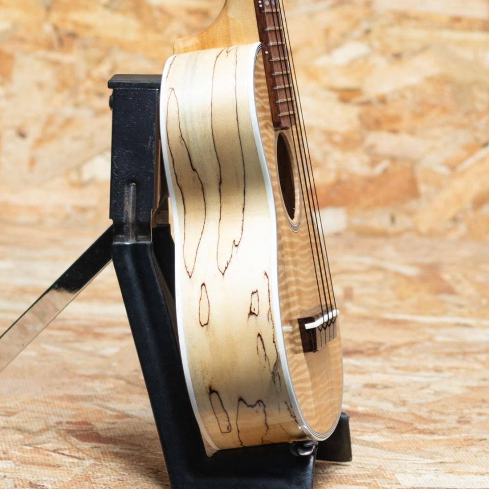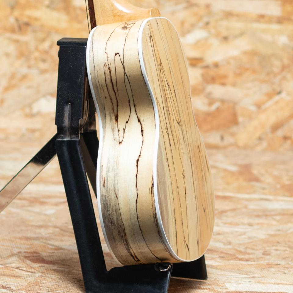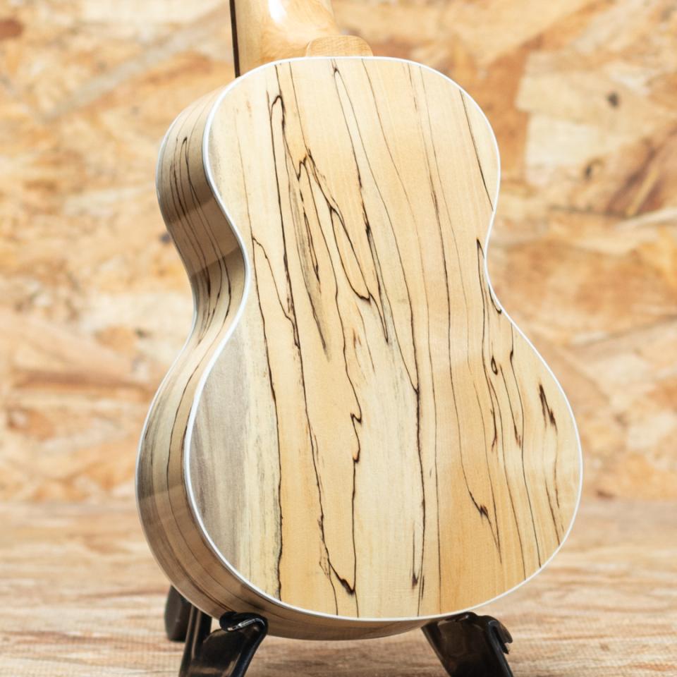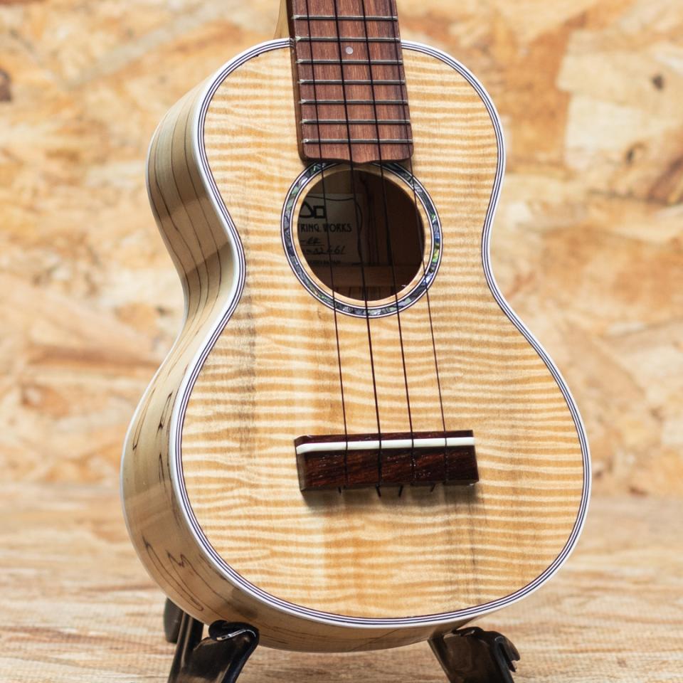京都にて占部英明氏、息子の直宏氏により手掛けられる国産手工ブランド。カーリー杢とスポルテッドの入った栃材を使用した目を引くソプラノモデル。