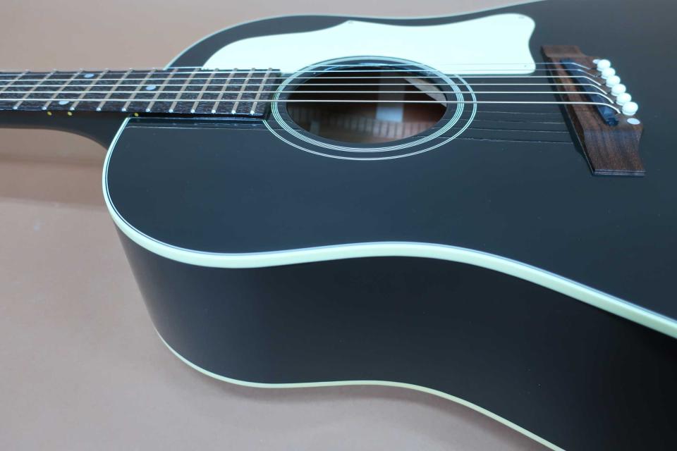 希少な限定200本の斎藤和義氏のシグネイチャーモデル、Gibson Kzuyoshi Saito J-45 Signature Modelの入荷です!本器はGibson アコースティック史上日本人初のシグネイチャー・モデルとして限定200本製作された希少モデルです。斎藤氏が所有されている1968年製の相棒”1号機”を基にピックガード、サウンドホール、ロゼッタ等を再現しネック・シェープは、ご本人所有の1934年 L-00、1947年製 J-50等を参考に製作されておりナット幅約43.8mm、トップにはシトカ・スプルース、サイド&バックはマホガニーで通常見られないサイドの割れ止め処理もされており、ローズ指板&ベリーダウン・ブリッジ、アジャスタブルの調整ネジを外しタスク・ブラックサドル(アジャスタブル・サドルを固定式サドルとしての仕様)、ダミーネジ付クリーム・ラージガード、ピックアップは本人のご要望に基ずきFishman Ellipse Matrix Blendが搭載され、アンダーサドル・ピエゾとコンデンサーマイクをブレンドした幅広いサウンドメイクが可能です。まさにギブソン・アコースティックが斎藤氏の要望を100%具体化したアーティスト・モデル!フィニシュもエボニー・グロス仕上げですが、黒の着色層は水研の工程無しの1層吹きでより深いブラックの色合いが演出されています。ネックは本人所有の1934 L-00と、1942年製 J-50を参考にデザインされた拘りの第1弾。