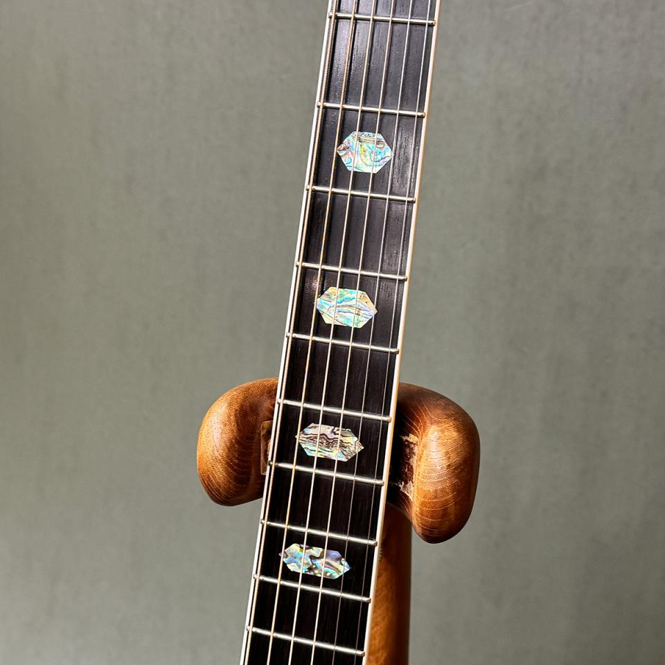 指板のヘキサンゴンインレイや、ボディのアバロンパーフリングが目を惹く1本です。