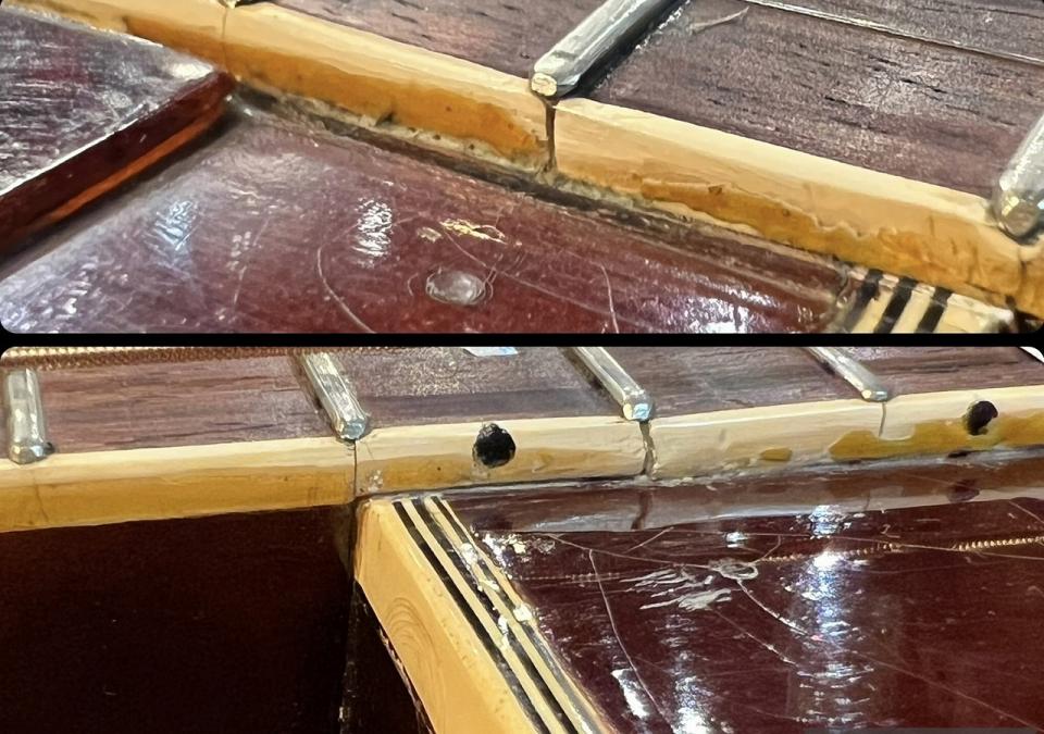かなり手は加えられておりますが、板割れ修理の痕跡はありません。ネックリセット、リナット、サドル交換、ブリッジ貼り直しが施され、プレイアビリティは全く問題ございません。