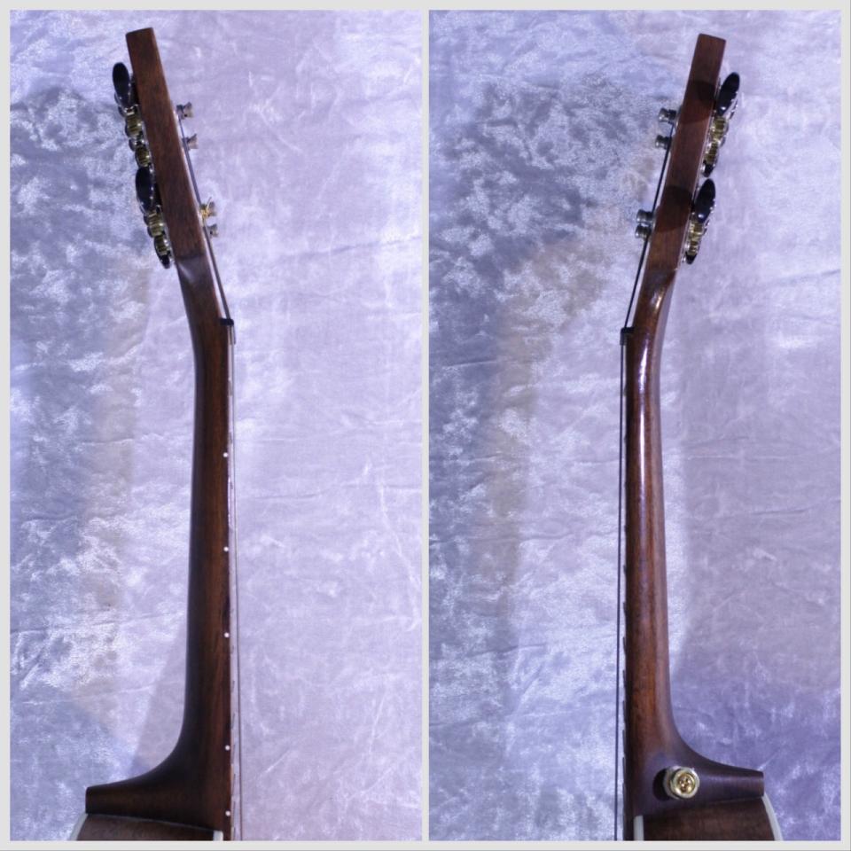 ネック裏のローフレット周辺、1弦側のサウンドホール横・サイドの塗装には演奏による艶が現れており、