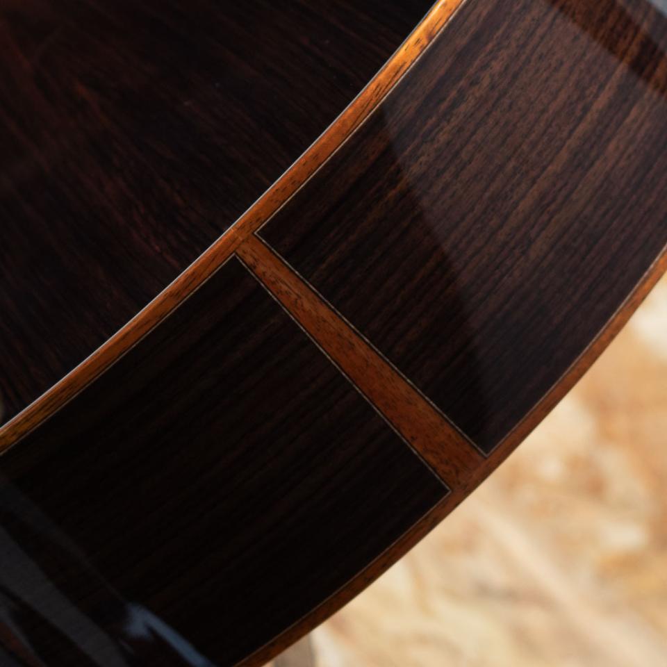 以前はフォークブームの一翼を担っていた国産ブランド”Morris”。2000年代初頭頃より大量生産から半手工品へというキャッチフレーズを掲げ、シフトチェンジ。現在ではフィンガーピッキング用ギターの顔と言えるファクトリーブランドとして長野県松本で良質なギターを生産しています。本器はHAND MADE PREMIUMラインにて製作された、ショップ・オリジナル・カスタムモデル” SJ-101 Custom "。イングルマンスプルーストップ、インディアンローズウッドサイド&バック、マホガニーネック、エボニー指板&スルーブリッジ、ゴトーブラックペグ、アバロンロゼッタ、ドットオフセットMOP指板インレイ、ウッドバインディング、スキャロップドXXブレイシング、フローレンタインカッタウェイ。豊かな音量と素早いレスポンス、高い演奏性を兼ね揃えるSJボディにフィンガースタイルに相性の良いをスキャロップドXXブレイシングパターンを採用。バック構造にはXバックを採用しています。程よいテンション感でハリのある太く奥行きのある低音にブライトで粒立ちの良い艷やかな高音。フィンガータッチへの反応も良く、弾き手の細かいニュアンスをしっかりと表現してくれます。外観の雰囲気を保ちながら、コストパフォーマンスの高い国産ハンドメイドプレミアムでの実現となる本モデル。ぜひご検討くださいませ。後付可能なブラックピックガードとオリジナルハードケースが付属します。