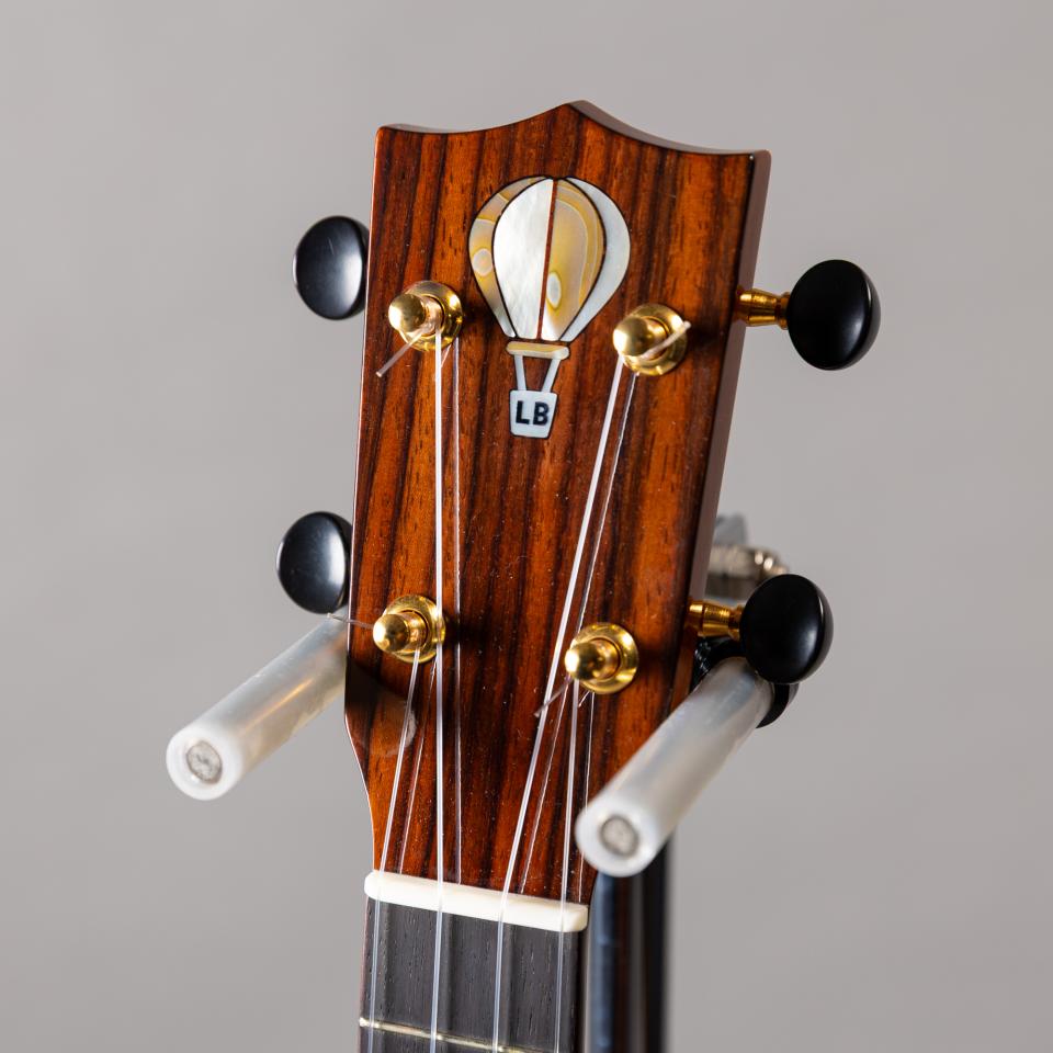 気球をモチーフにしたヘッドインレイは、ウクレレバードがデザインした特注仕様。美しい輝きのアバロンと白蝶貝を贅沢に使用しています。インレイが際立つよう、ヘッド突板にはローズウッドを採用。