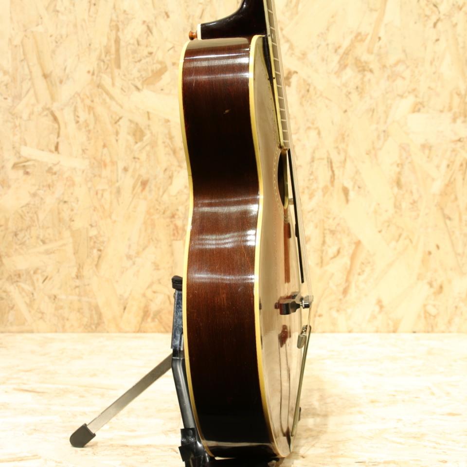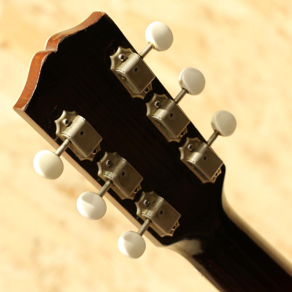 今でこそフラットトップの印象が強いですが元々はアーチトップギターやマンドリン、バンジョー等を製作するところから始まっているギブソン。その中でもギブソンアコースティックアーチトップ"L-4"は1912年に発売が開始されました。本器はオーバルホール仕様、サウンドホールロゼッタがチェック柄の1927年製。スプルーストップ、メイプルサイド&バック、マホガニーネック、エボニー指板&ブリッジ、パーロイド指板ドット、ホワイトボディ&ヘッドバインディング、アイボロイド指板バインディング、チェック柄ロゼッタ、1プライピックガード、ナット幅約44ミリ、テーパードヘッド。ネックヒール裏にはストラップピンが装着されています。発売当初よりオーバルホール仕様で生み出されたL-4。細やかな仕様変更こそ間に挟まりますが、本器が生まれた直後の1928年からは大きな仕様変更が入ります。サウンドホールが正円形状となり、12Fジョイントから14Fジョイントへと変化。1935年からはFホール仕様となり、最終的には1956年に製造終了となってしまいます。本器のサウンドホールロゼッタはチェック柄となっており、この仕様は1927年のみ。非常に貴重な1本です。ボディ材は単板のモノを削り出して製作が行われています。ネックシェイプは20年代から30年代にかけてよく見られる厚みのあるVシェイプ。芯のハッキリとした響き、そして後の時代のモノと比べても軽やかに立ち上がる反応性。アーチトップ特有の低音がスッキリとした響きでありつつも音色自体は太く、もたつきなく厚みのあるサウンドを出力してくれます。特にプレーン弦の押し出し感のあるトーンとボリューム感はメロディラインの演奏にも最適と言えるでしょう。枯れて乾いたノスタルジックな音色は昔ながらのジャンル、特にジャズにおいて非常に趣のある味わい深い響きを奏でてくれます。遠達性のあるサウンド、空気感を含みガランとしたトーンは唯一無二です。ペグはクルーソンタイプのノーラインタイプに交換されています。ボディエンド箇所テールピース横に過去木部クラックが入った跡が見られますが、補修済みで問題なく使用することが出来ます。ボディサイドショルダー1弦側に擦れて塗装が剥がれてしまっている箇所、6弦側にも塗装が擦れて剥がれた痕を赤の塗料でタッチアップされ違和感の少ない状態にされています。その他テールピースの下の当てキズやバインディング割れの補修跡、ボディ塗装面の僅かな欠けがボディバック6弦側に1ヶ所、細やかな当てキズ等全体的に見られますが、オリジナル性の高い状態をキープされた個体。ブリッジの弦高調整ネジの高さには上下共に余裕があり、ネックのコンディションも非常に良好。実用性も高く、コンディションも非常に良い貴重なアーチトップギターです。古き良きアーチトップギブソン、トラッドなスタイルを求める方にはうってつけの1本です。是非お手元でご体感下さいませ。