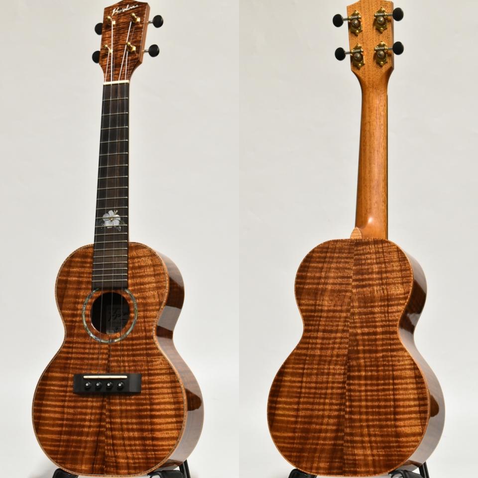 ハワイ・オアフ島ハイエンドウクレレ「Ko'olau(コオラウ)」、最高グレード材の中から特にカーリー(縮み杢)の浮き出た素晴らしいハワイアンコアを選定、ハイビスカスインレイや細部にまで拘った特注品です。