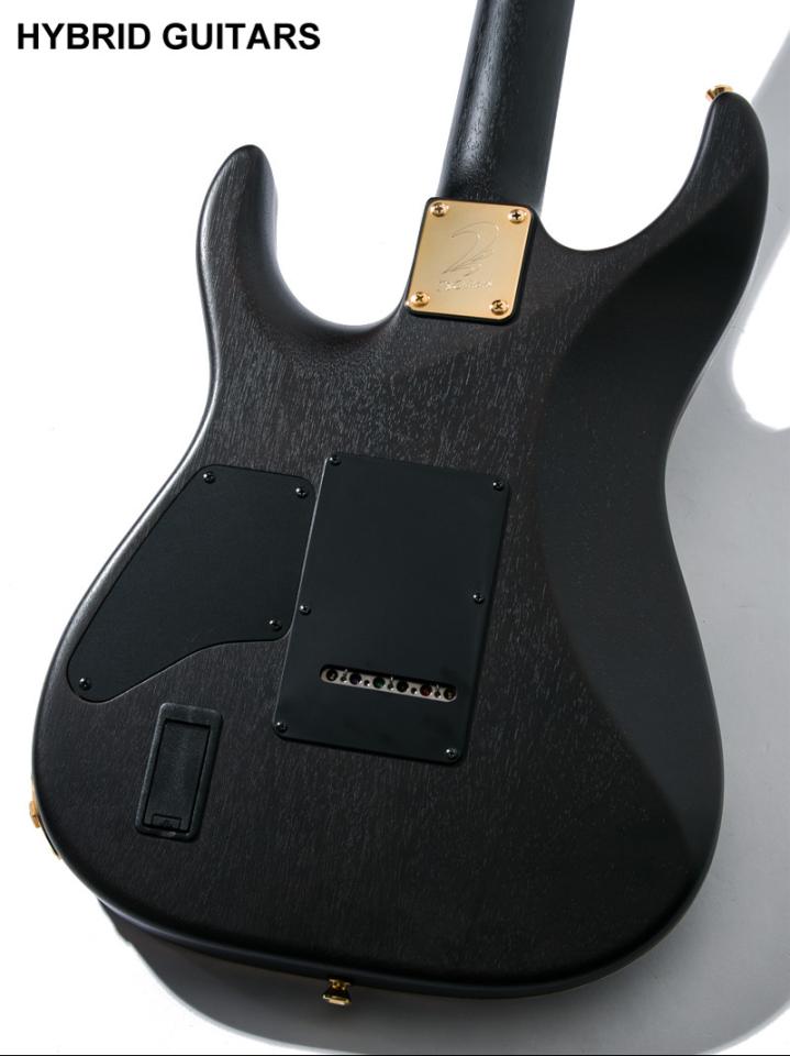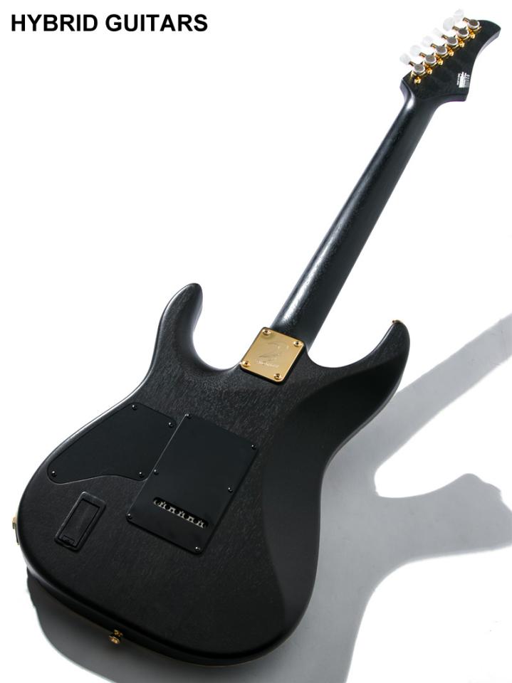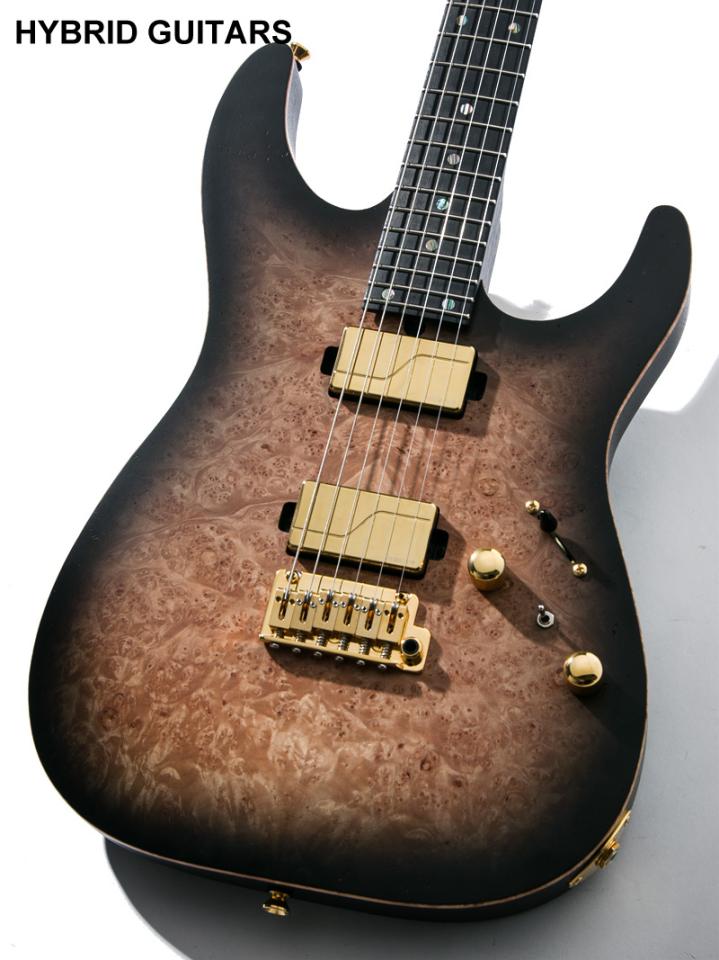 本機はボディトップにBurl、ボディバックとネックにMahogany、指板にEbonyを使用しています。塗装にはサテンフィニッシュを採用し目止めを施さず導管を出すことで木材の質感を感じられる肌触りです。ピックアップにはコイルレス仕様のアクティブピックアップであるFishman Fluence Modern Humbucker Alnico Pickup Setを搭載しています。5-Way PU Selectorによりコイルタップサウンドでのプレイも可能です。ペグとローラーサドルを採用したブリッジはGotoh製を搭載しています。