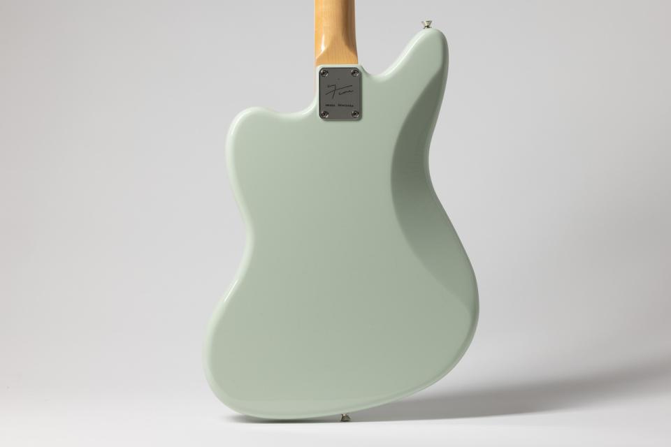 エイジングされたソニックブルーをイメージしたオリジナルカラーに加え、水張りデカールを採用することで、自身が所有するAmerican Vintage ’65 Jaguar同様にヴィンテージギターフィールを演出しています。