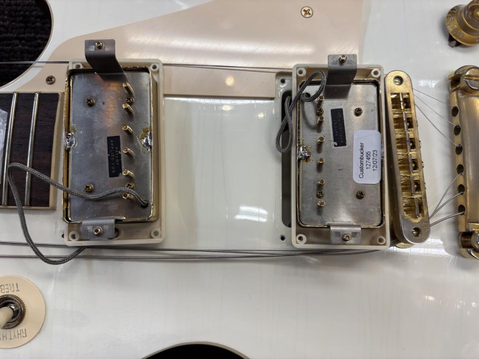 コンデンサにはフロントにMontreux製Retrovibe Oil Capを、リアにOrange Dropを搭載し、ピックアップにはGibson Custombucker!
