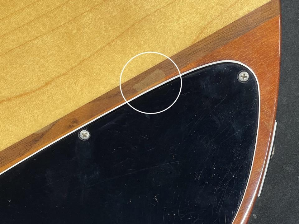 ボディバックコントロールキャビティ、ブリッジスタッド、ボディホーン付近等、塗装に負荷のかかる部分で経年による塗装浮きが生じていますが、醜く目立つレベルではありません。