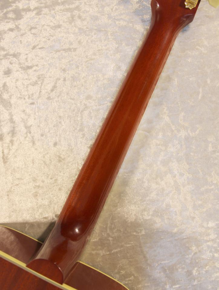 マホガニーサイド&バック、マホガニーネック、ローズウッド指板、ローズウッドノーマルスロットブリッジ、ゴトーキーストーンペグ、ダブルパラレログラム指板インレイ、ダブルリングロゼッタ、分厚い掘り込みべっ甲柄ピックガード、スキャロップドXブレイシング。