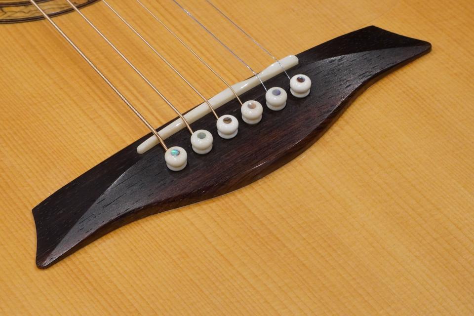 ブリッジは、赤黒いブラジリアンローズウッド。ボーン製のブリッジピンのアバロンドットが鮮やかで!