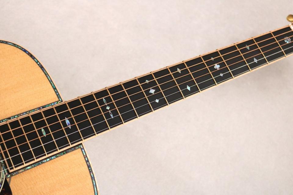 また、ルックス面におきましてもStyle45らしくアバロン貝による装飾はもちろんのこと、厳選されたグレードの高い木材を採用しているため、ボディのどこから見ても芸術品のような美しく整った木目をしております。弾いて楽しむのももちろんですが、見ているだけでも惚れ惚れしてしまうようなルックスに仕上がっております。
