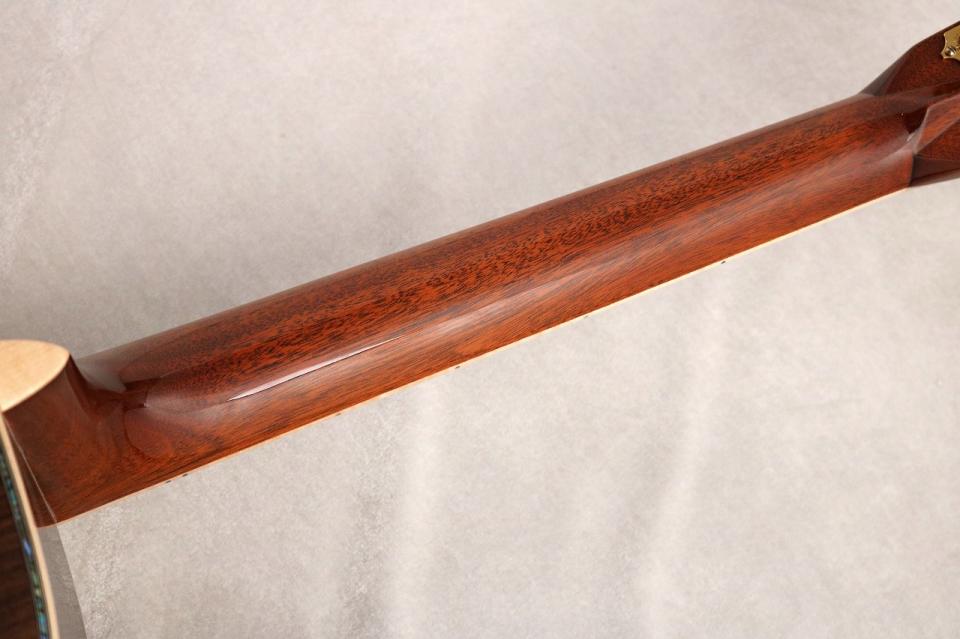 最新の仕様としては、アバロンドットの付いた高反発金属Liquidmetalで作られたブリッジピン。ボディ内部のブリッジプレートには硬質な素材により音量を増幅するカーボンファイバー素材を採用。ネックシェイプは44.5mmナット幅の全体的に薄め、さらにローポジションからハイポジションに進むにつれネック裏の頂点ががわずかに低音弦側に寄っていくような非対称の新しいネック形状が挙げられます。