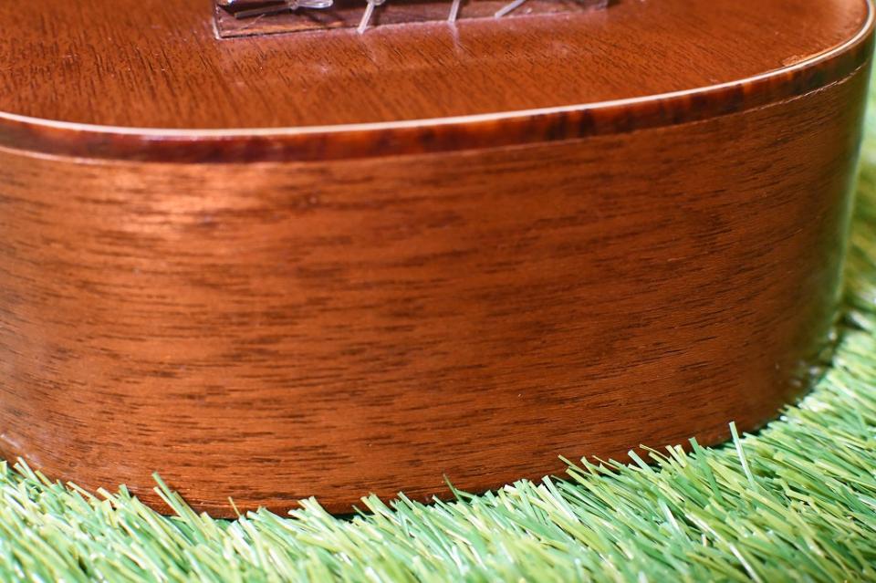 マホガニーボディにローズウッド指板という構成のソプラノサイズで、べっ甲柄のバインディングが施されています。