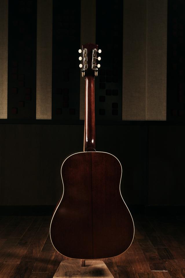 トップとバックにシングルプライ・バインディングが施されたボディは、グロス・フィニッシュの光沢を若干抑えた “ニューヴィンテージ・グロス“ 仕上げを採用。 僅かに退色したカラーを再現した“ウォッシュド・ヴィンテージ・サンバースト“との組み合わせにより、 ヴィンテージの質感溢れるルックスになっています。ピックガードは、べっ甲色のクラシックなティアドロップ・シェイプで、J-45のルックスを引きたてます。さらに、サウンドホール周りのパーフリングは奥田民生氏愛用のJ-45と同じ7層になっており、究極までギブソンのオリジナルに近づけた拘り抜いた出来栄えとなっています。