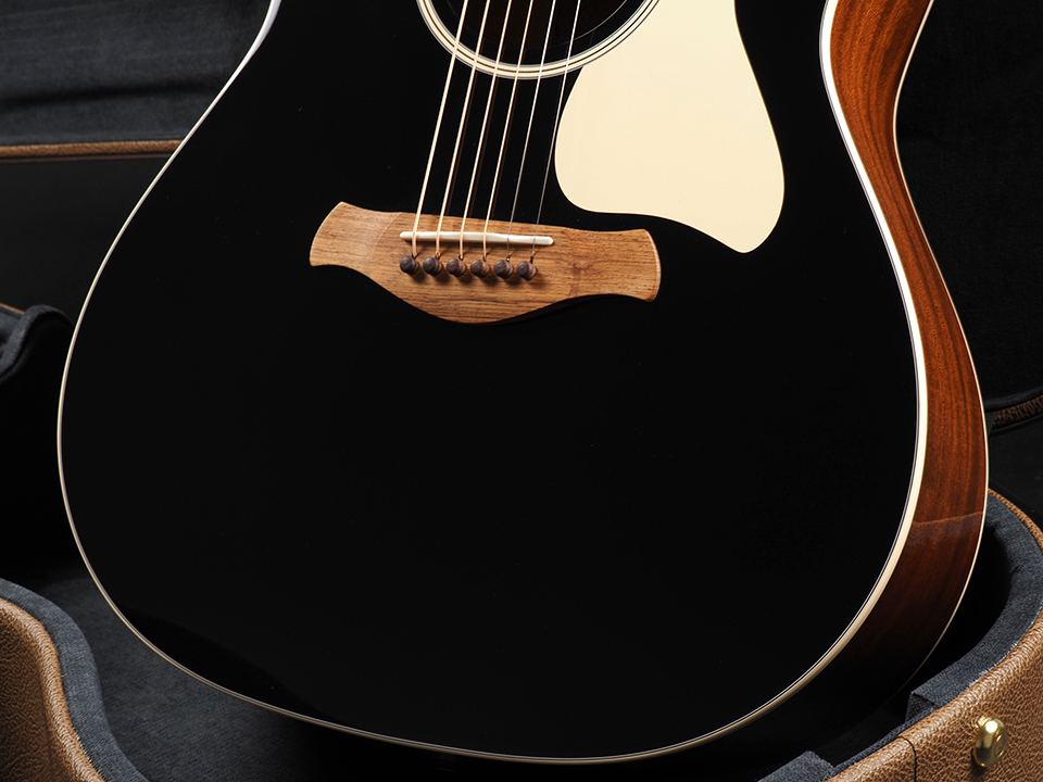 ルックス面では、ブラックトップ仕上げのトップにクリームカラーのピックガード、スクリプトロゴをあしらったモディファイド・ヘッドストックなど、1950年代のアコースティックギターを彷彿とさせるビンテージテイストが随所に光ります。指板とヘッドにはクリーム色のクレストインレイを施し、高級感あるルックスに仕上げています。