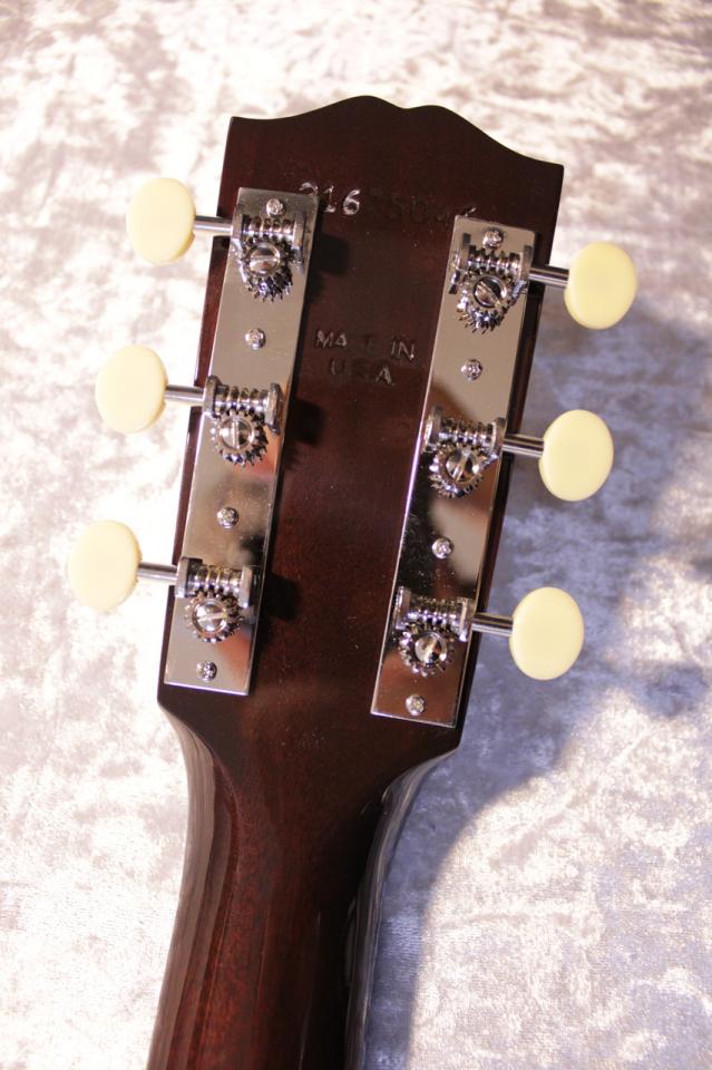 30年代のごく初期に生産されていたエボニーフィニッシュを彷彿とさせる本器は、トップ材にシトカスプルース、サイド&バック材にマホガニー、赤べっ甲柄ピックガード、Golden Age(クリームボタン)チューナー、レクタンギュラーブリッジ、ヘッドロゴはスクリプトと、当時のルックスを思い起こさせます。