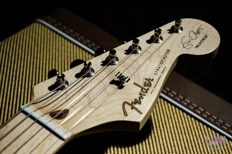 本人の仕様に基づきソフトVシェイプのネックを採用、もちろんブリッジは木片で固定されております。そしてヘッドにはクラプトンのサインとこのカラーのクラプトンモデルのみに入る "Blackie" の文字がプリントされています。