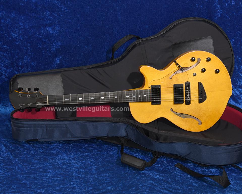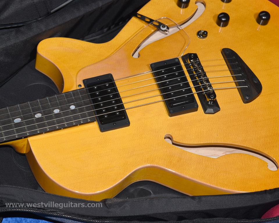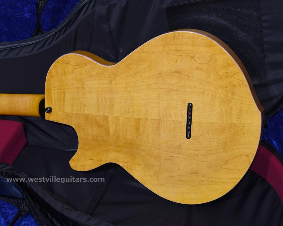 ボディは削り出しのシトカ・スプルース単板トップ、センターブロック部分と一体で削り出された単板のハードメイプル・サイドリム、そして同じく削り出しのハードメイプル単板バックという、「オール削り出し単板」構造。Westvilleのスタンダード・モデル「Butter」をさらに進化させた、ハイスペックなセミホロウ・モデルです。