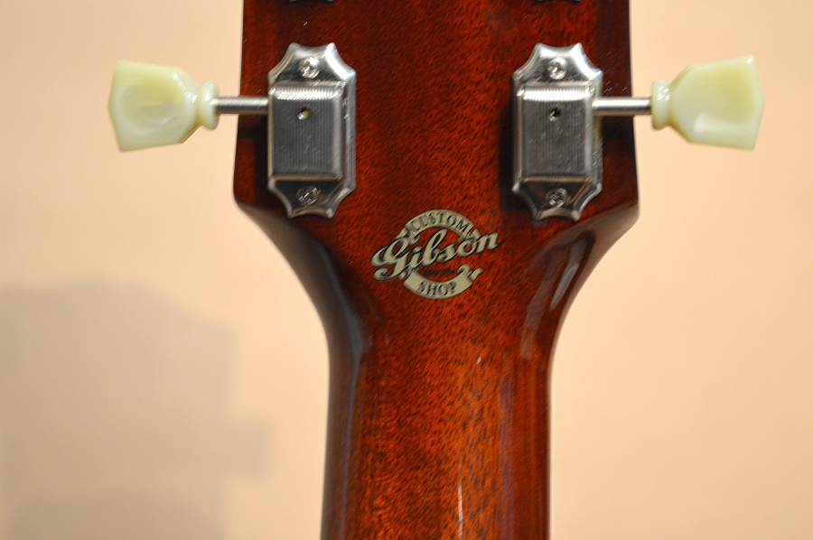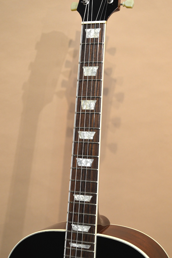 ラミネイト・スプルースTOP、マホガニーSIDE&BACK、マホガニーNECK、ローズウッド指板&ブリッジ、タスク製アジャスタブル・サドル、ラダー・ブレーシング、P-90PU、実測44.2mmナット、24.75インチ・スケールの16インチ・ラウンド・ショルダー。2006年と言えばまだ山野さんが代理店を務めていた時期なので、ちょっと不思議に思い調べてみましたら、、2006年のカタログにはまだ1964 J-160Eが掲載されているんですが、プライス・リストの方は2005年までしか価格が載っていません。2007年にはギブソン・ジャパンが発足し、また単板トップのJ-160Eに戻ってしまいますので、、山野さんのオーダーをこなした後にちゃっかりと同じ仕様でカスタム・ショップで作ったのかも知れませんね(笑)。スペック的には1964 J-160Eと全く同じですし、、、強いて言えばSIDE&BACKからネックに掛けてのダーク・ブラウンのカラーが明るめの色になっている点と、ネック裏のカスタム・ショップのシールが貼られているくらいかと思います(笑)。