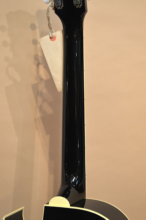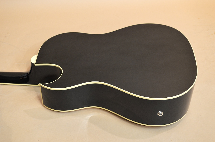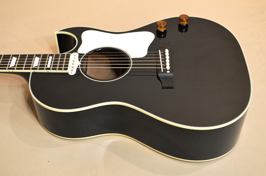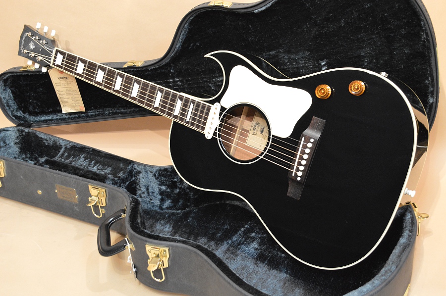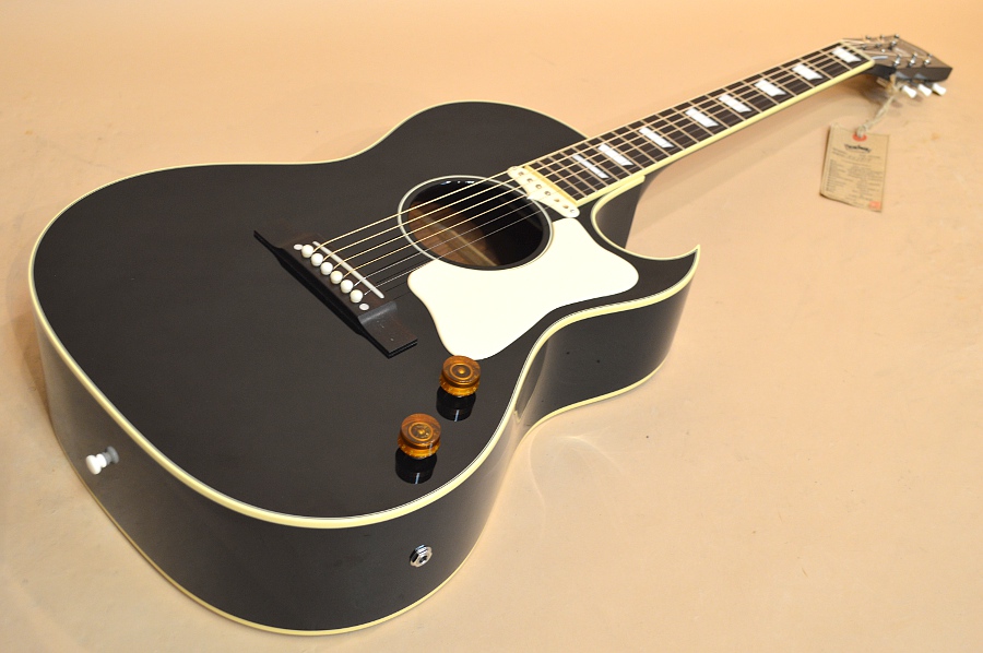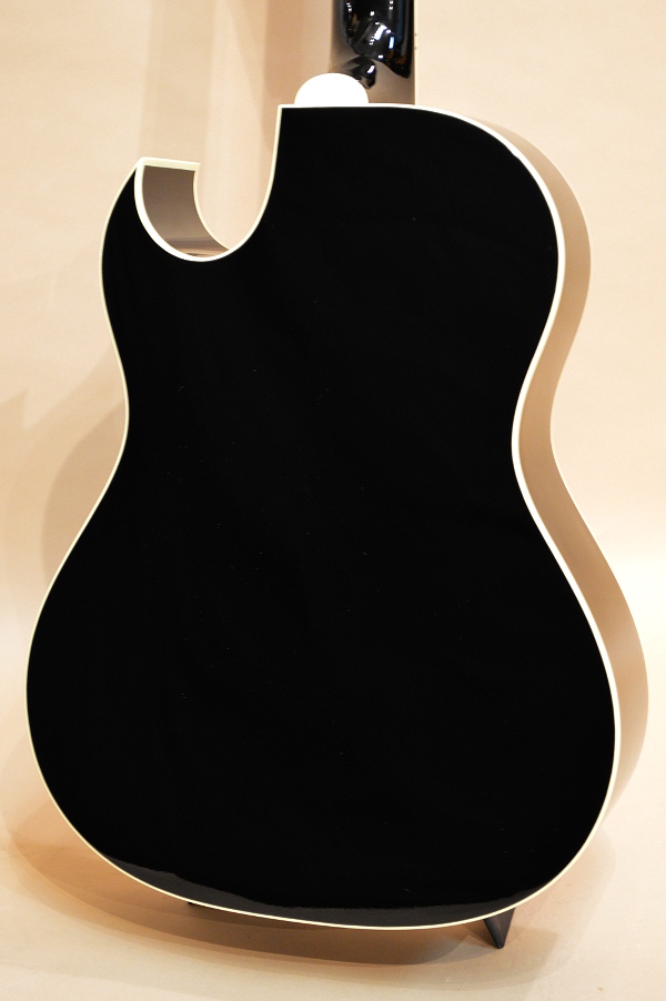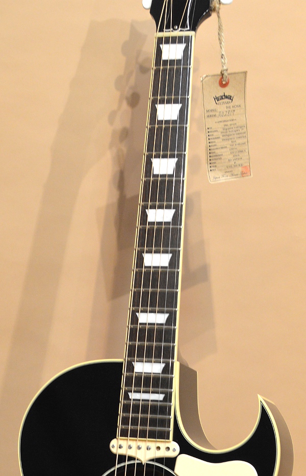 ソリッド・シトカ・スプルースTOP、ソリッド・シンガポール・マホガニーSIDE&BACK、アフリカン・マホガニーNECK、マダガスカル・ローズウッド指板&ブリッジ、実測43.3mmナット、628mmスケールのカッタウェイ・ボディー。カタログ・モデルではホンジュラス・マホガニーSIDE&BACKでインディアン・ローズウッド指板&ブリッジだったところを、稀少なシンガポール・マホをSIDE&BACKに採用し、指板&ブリッジはマダガスカル・ローズウッドにアップ・グレードしたen.guitarでしか販売できなかったカスタム・モデル!そしてカラーリングはレギュラー生産時には存在しなかったブラック・フィニッシュです!ブラック・フィニッシュのホンクは確か2本しか作らなかったので、その稀少性が分かるというものでしょう!PGやバインディングは落ち着いたクリーム・カラー、PUカバーは黒とクリームを用意していて、現在はクリーム色の方が装着されていますが、黒のPUカバーも付属しています。また、新品時にはヘッドウェイ・オリジナルのトラスロッド・カバーで販売しましたが、現在は付属で付けたギブソン・シェイプの物になっています。オリジナルの方もちゃんと付いていますのでご安心を!