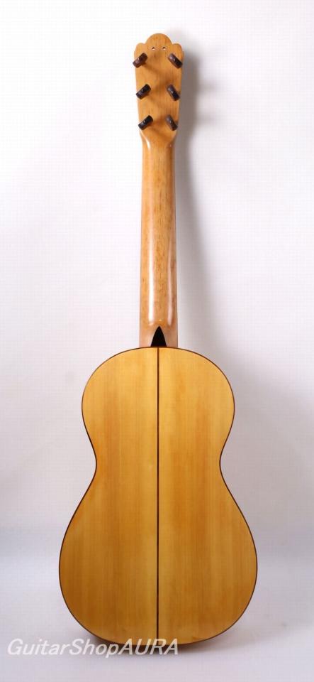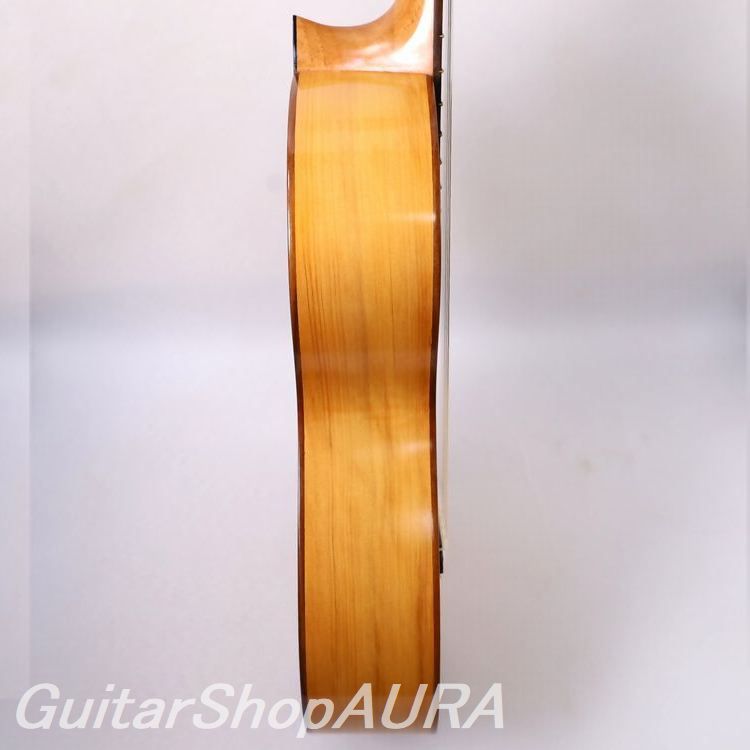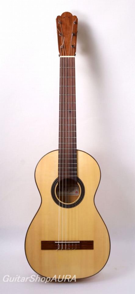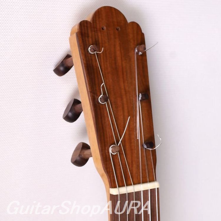 ジョアン・ペリッサ製作のトーレスモデル、アントニオ・デ・トーレス1887年製 SE109のコピーモデルです。ジョアン氏曰くトーレスの製作した中でも最もエコノミックなモデルであるこのオリジナルは、シープレス材によるボディ、マホガニーまたはローズウッドのヘッド、ネック、指板そしてブリッジプレート、糸巻きは木ペグ、極めてシンプルな装飾等々コンサート用に製作された充実したモデルと比べると明らかにクオリティは下がるものの、かえって最小限の素材の中にも最良の響きを有したこの銘工のエッセンスが感じられる一本とのこと。ジョアン氏製作のこの愛すべきコピーモデルはその「エコノミックな」面も忠実に再現しつつ、やはり現代のギターでは表現できない独特の古雅な味わいを備えたものとなっています。音は小柄なボディからは想像もつかないほどに太く豊かに鳴り、木質の生々しい響きが何とも心地よく、発音のレスポンスも申し分ありません。