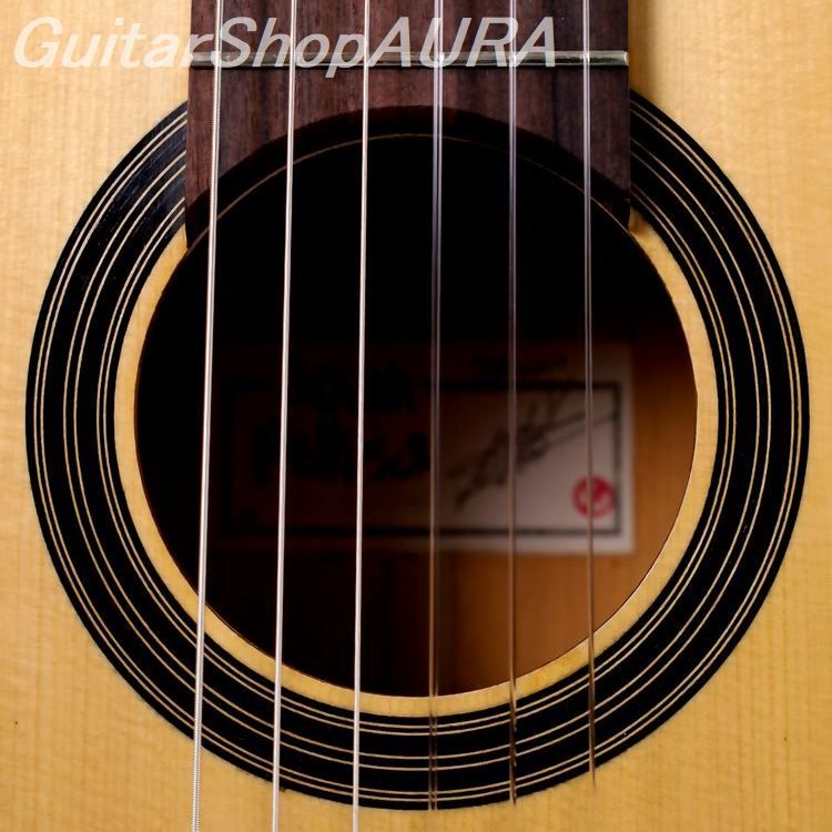 表面板力木構造は、サウンドホール上側(ネック側)に1本のハーモニックバーと薄く小さな1枚の補強プレート、下側(ブリッジ側)は1本のハーモニックバー、そして左右対称の5本の扇状力木というシンプルな配置で、ボトム部にクロージングバーのない設計になっています。レゾナンスはBの少し下に設定されています。