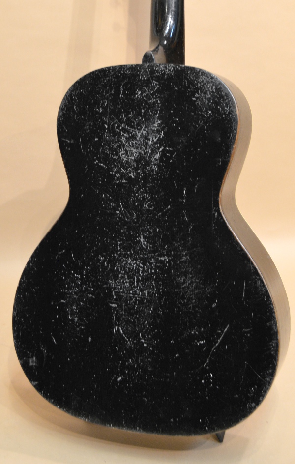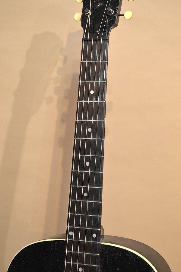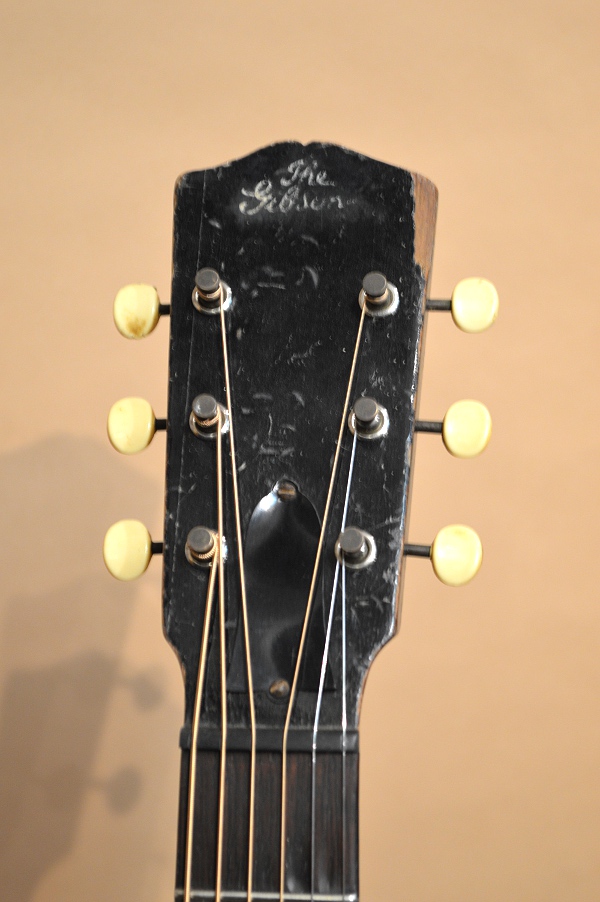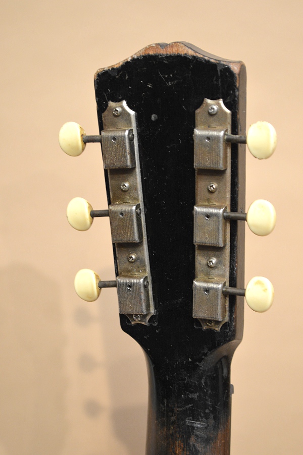 楽器のコンディションは長年現役としてバリバリに使われてきたことが伺い知れる貫禄のルックスになっていますが、使うための楽器としてはしっかりとメンテナンスが行き届いています!全体的に擦り傷や弾きキズ、打痕等多数あり、ボディー角や、ネック裏は木地が露出してしまっている箇所なんかもありますが、およそ100年近く現役で活躍してきた楽器らしい佇まいで、ビンテージ・ギターに理解のある方なら取り立てて大騒ぎするほどのダメージは無いかと思います。唯一ヘッドの1弦側先端がざっくり欠けていますが、、まぁこれも100年選手ならではの貫禄と言うものでしょう。マホ・トップの割にはトップの変形もほとんど無く、クラック等の木部の割れも見当たりません。ペグは50年代のクルーソンに交換されています。