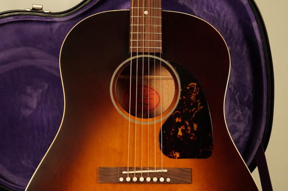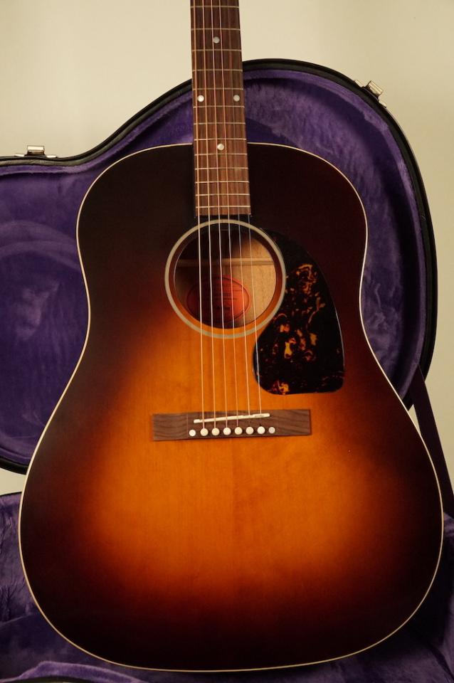 トップとバックにシングルプライ・バインディングが施されたボディは、グロス・フィニッシュの光沢を若干抑えた “ニューヴィンテージ・グロス“ 仕上げを採用。 僅かに退色したカラーを再現した“ウォッシュド・ヴィンテージ・サンバースト“との組み合わせにより、 ヴィンテージの質感溢れるルックスになっています。ピックガードは、べっ甲色のクラシックなティアドロップ・シェイプで、J-45のルックスを引きたてます。さらに、サウンドホール周りのパーフリングは奥田民生氏愛用のJ-45と同じ7層になっており、究極までギブソンのオリジナルに近づけた拘り抜いた出来栄えとなっています。