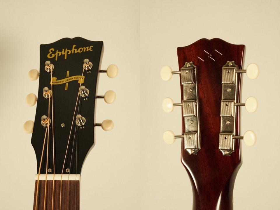 エピフォンの“スクリプト&バナー”ロゴがあしらわれた“オープンブック・ヘッドストック”と呼ばれるギブソンと同じヘッド形状があげられます。また、ヘッドに搭載されているチューナーも、ギブソンと同じクリームボタン・タイプを採用し、一見するとギブソンと見分けがつかないほどの再現性を持ちます。