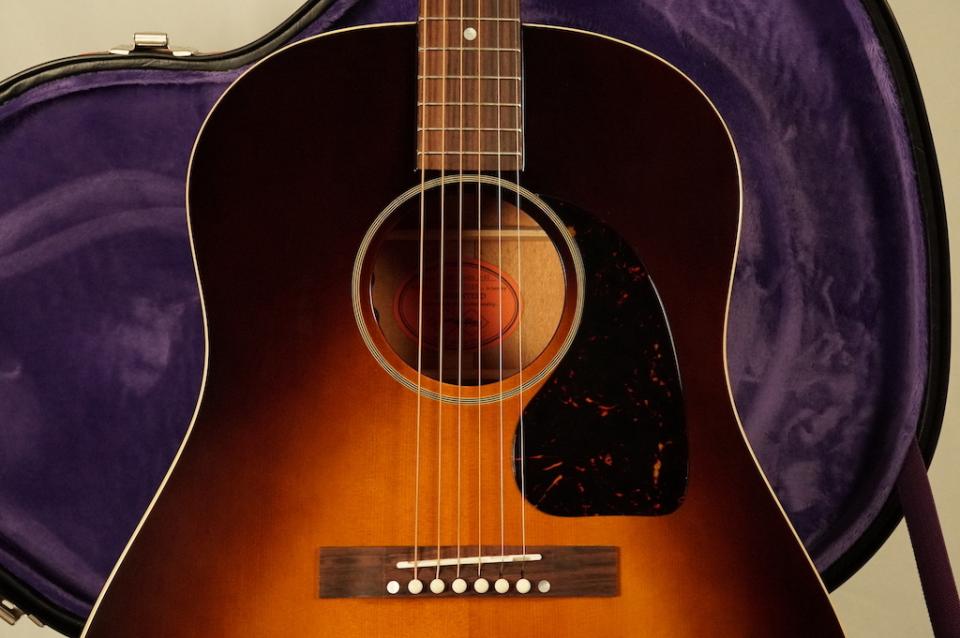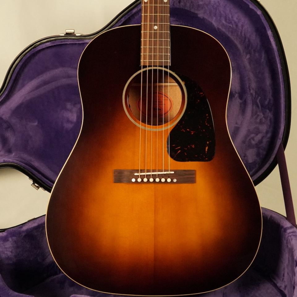 トップとバックにシングルプライ・バインディングが施されたボディは、グロス・フィニッシュの光沢を若干抑えた “ニューヴィンテージ・グロス“ 仕上げを採用。 僅かに退色したカラーを再現した“ウォッシュド・ヴィンテージ・サンバースト“との組み合わせにより、 ヴィンテージの質感溢れるルックスになっています。ピックガードは、べっ甲色のクラシックなティアドロップ・シェイプで、J-45のルックスを引きたてます。さらに、サウンドホール周りのパーフリングは奥田民生氏愛用のJ-45と同じ7層になっており、究極までギブソンのオリジナルに近づけた拘り抜いた出来栄えとなっています。