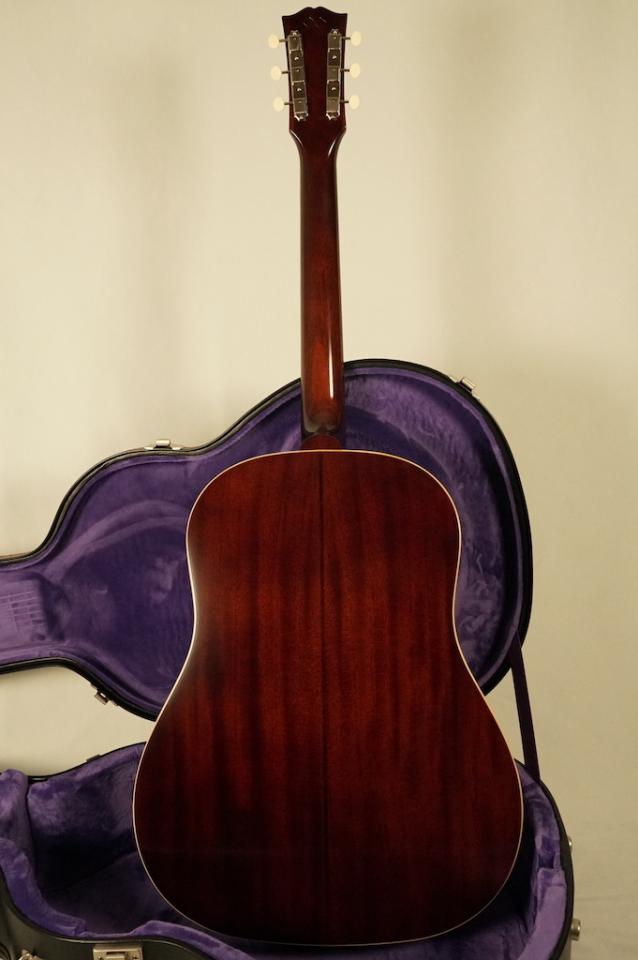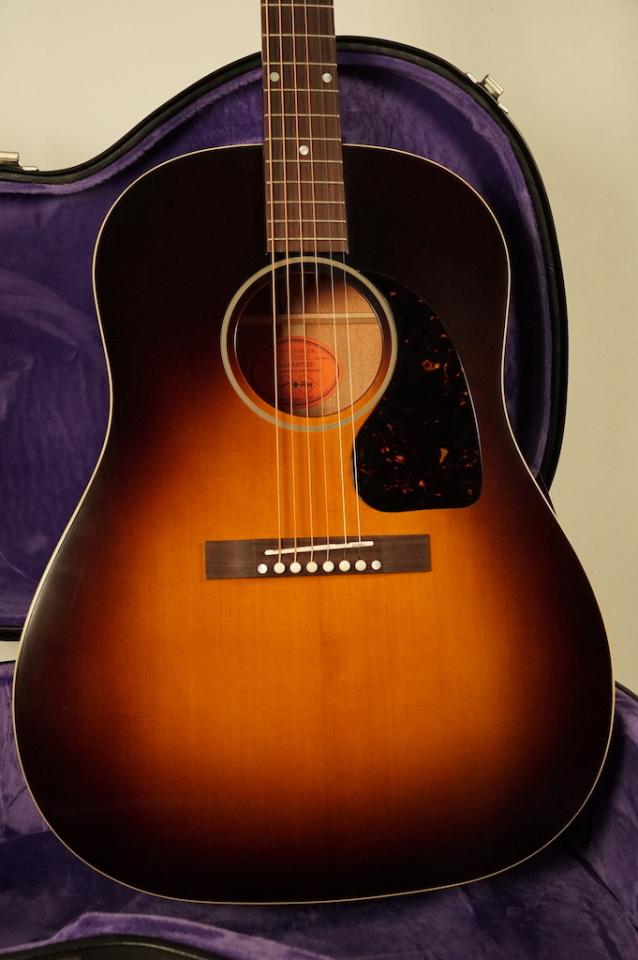 トップとバックにシングルプライ・バインディングが施されたボディは、グロス・フィニッシュの光沢を若干抑えた “ニューヴィンテージ・グロス“ 仕上げを採用。 僅かに退色したカラーを再現した“ウォッシュド・ヴィンテージ・サンバースト“との組み合わせにより、 ヴィンテージの質感溢れるルックスになっています。ピックガードは、べっ甲色のクラシックなティアドロップ・シェイプで、J-45のルックスを引きたてます。さらに、サウンドホール周りのパーフリングは奥田民生氏愛用のJ-45と同じ7層になっており、究極までギブソンのオリジナルに近づけた拘り抜いた出来栄えとなっています。