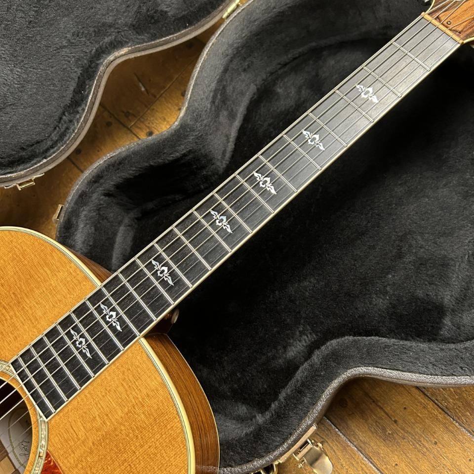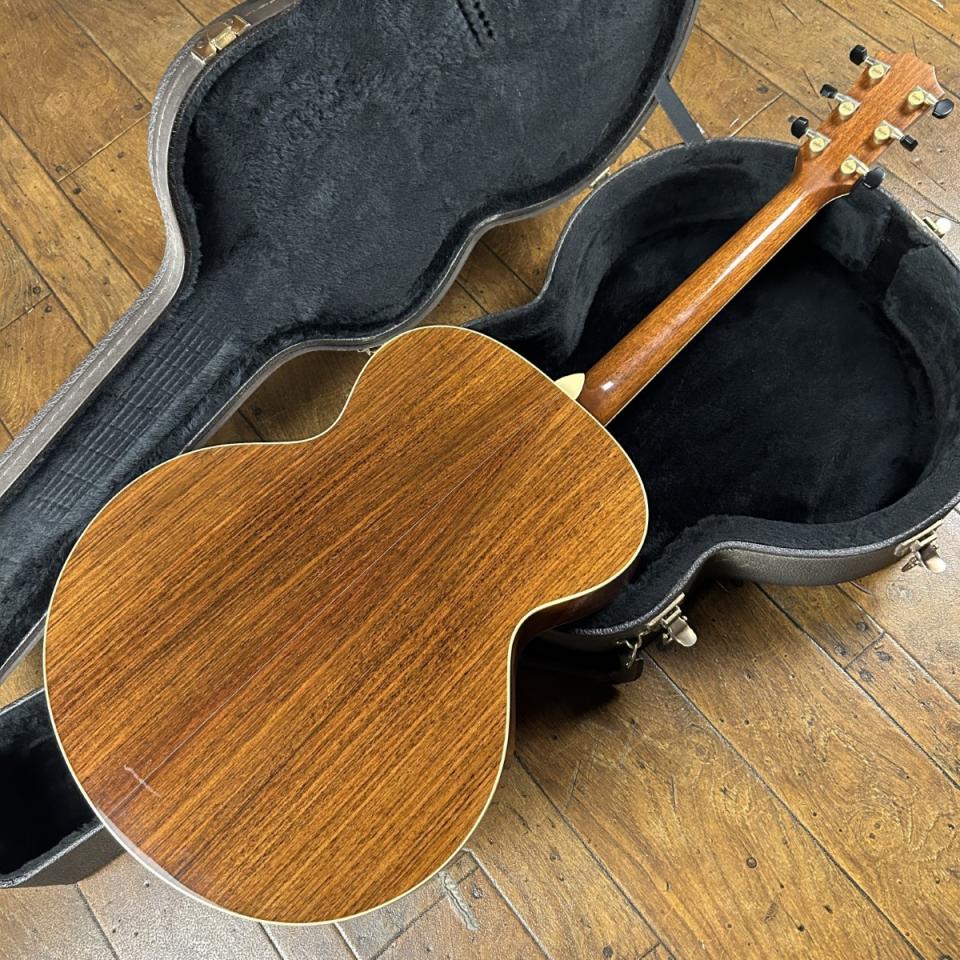ジャンボサイズのボディはスプルーストップにインディアンローズウッドサイド/バックのオール単板仕様。