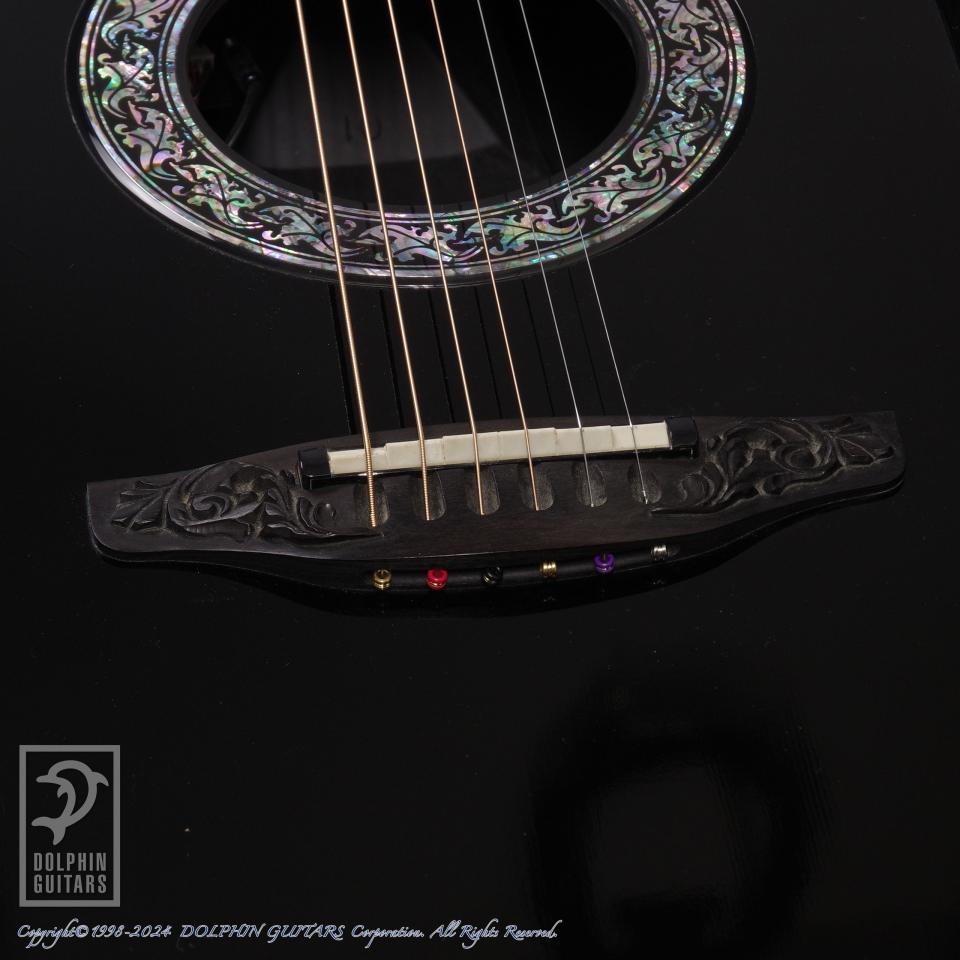 ブラックカラーのトップ面に豪華なアバロンのパーフリングやロゼッタの輝く逸品。ルックスはまさにポールサイモンが手にした"あの"カスタムレジェンドです。