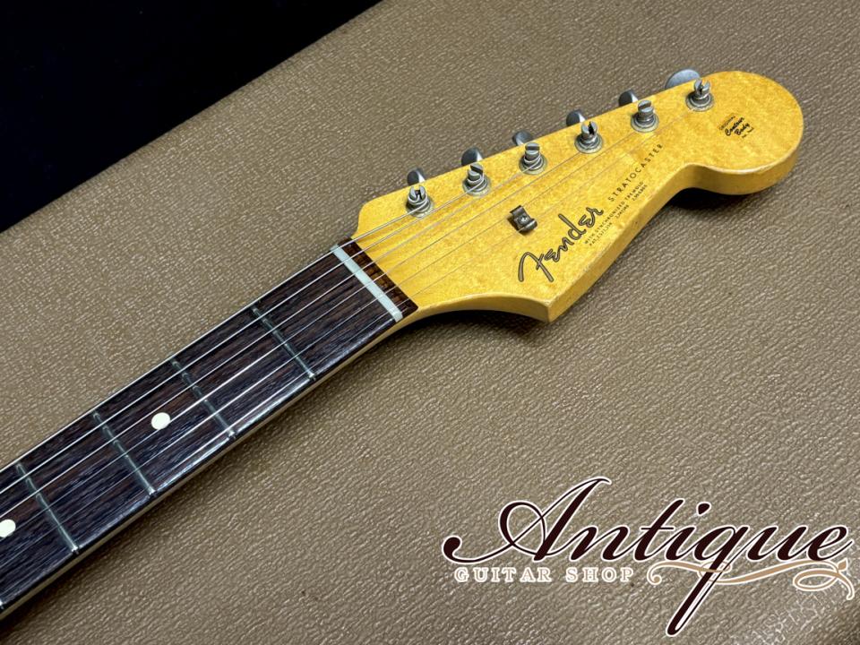 まずそのスペックとしては、カスタムショップならではの厳選された良質なアルダーボディに、当時のカスタムカラーの中でも特に人気の高いオリンピックホワイトカラーにてフィニッシュ。ヴィンテージフィールを再現すべく、ビッシリと入ったウェザーチェックや歴戦のダメージを再現したリアルなハードレリック加工が施され、更に今回の一本はそこからガンガン弾き込んできた事でリアルなエイジングが加わり、2013年製と近年のリイシューモデルとは思えない、ヴィンテージ同様の貫禄を持つ極上のルックスとなっております。続いてネックはリフトソーン(追い柾目)寄りの木取りにて、バリトラではございませんが、各所にフィギュアドが見受けられる、見るからにサウンドの良さを感じさせる素晴らしいメイプル材が採用されております。極め付けはラウンド貼りにて採用されたローズウッド指板ですが、非常に黒々としたコントラストかつ、その奥にはシッカリと黒の杢目も確認出来るハカランダライクな極上材となっております。また重量も約3.36kgと演奏性とサウンドを両立するストラトのベストウェイトという点も嬉しいポイントです。ナット幅は約42mm、ネックシェイプはやや細めのCシェイプ、フレットはジャンボタイプ、指板ラディアスは9.5”を採用し、ネック裏はスムースなサテン仕様となっており、ヴィンテージフィールながらプレイアビリティの高さも伺えます。その他スペックとしては、スモールヘッド&スパゲティロゴ、12Fナロウのクレイドットポジションマーク、11点留め鼈甲ガード、FENDER刻印のシングルラインクルーソン、小さい字体のFENDER PAT.PENDの刻印サドルのシンクロブリッジ等が挙げられます。