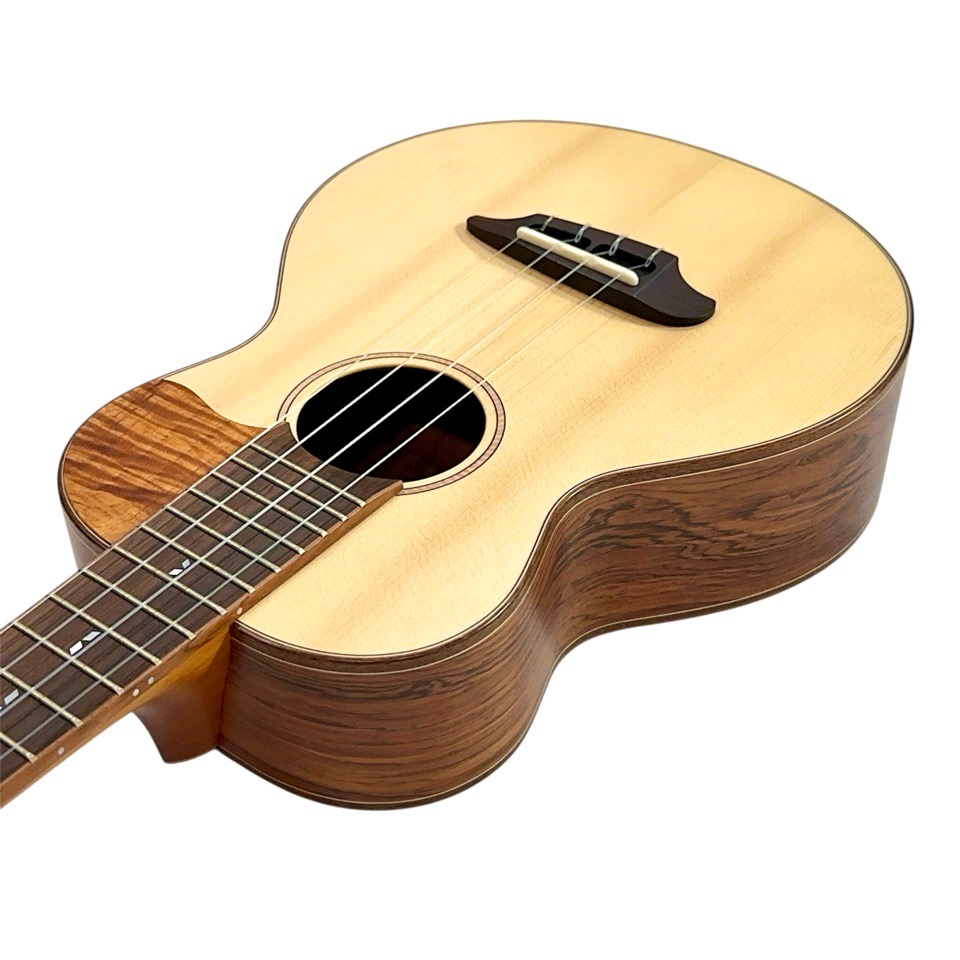 滋賀県米原市に工房を構える、TODA 戸田真次氏。「魂は細部に宿る」の言葉通り、仕上げの美しさ・精度の高さが目を惹く。軽く爪弾いても遠鳴りする響きは、ウクレレの軽やかさとギターのふくよかさを兼ね備えている。ソロ弾きでは一音一音の輪郭が引き立ち、アンサンブルでは他の楽器に埋もれずに調和する音色。これぞ日本のモノづくりと言えるウクレレを製作されています。