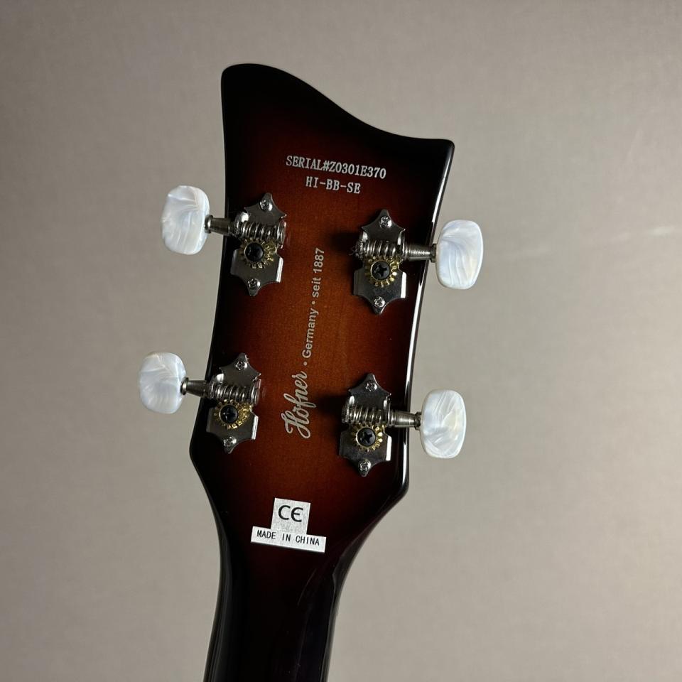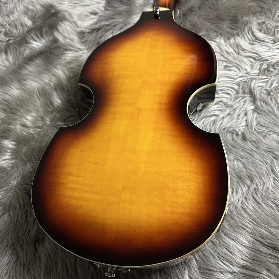 特徴的なヴァイオリンシェイプのボディは、同社の他モデルと同じくスプルーストップ、フレイムメイプルサイド&バックのホロウボディとなっており、あの特徴的な暖かみのある響きを生み出すと共に、エレキベースとは思えない軽量なボディとなっております。お馴染みのショートスケールのメイプルネックは、ベースとは思えない程の細身に仕上げられています。また当機はネックのジョイント部にあたる部分にストラップピンを備えることによって、ストラップの着脱も容易になっています。