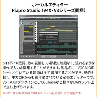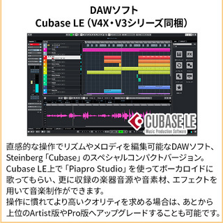 歌詞とメロディを打ち込むだけで、より自然により表現豊かになった初音ミクは、ポップス、ダンス、ロックほか、どんなジャンルも、あなたの思うままに歌ってくれます。さらに声に吐息や声質変化などを加える「E.V.E.C.」(イーベック)機能やVOCALOID4のクロスシンセシス、グロウル機能を操作することで、メリハリの有る歌声を作ることが可能になっています。また次世代型ボーカルエディター「Piapro Studio」を標準装備し、数百もの楽器を収録した音楽制作ソフトCubase LEも同梱しているので、 ボーカルトラックから伴奏制作まで、『初音ミク V4X』を手にしたその日からすぐに音楽づくりを楽しめます。
