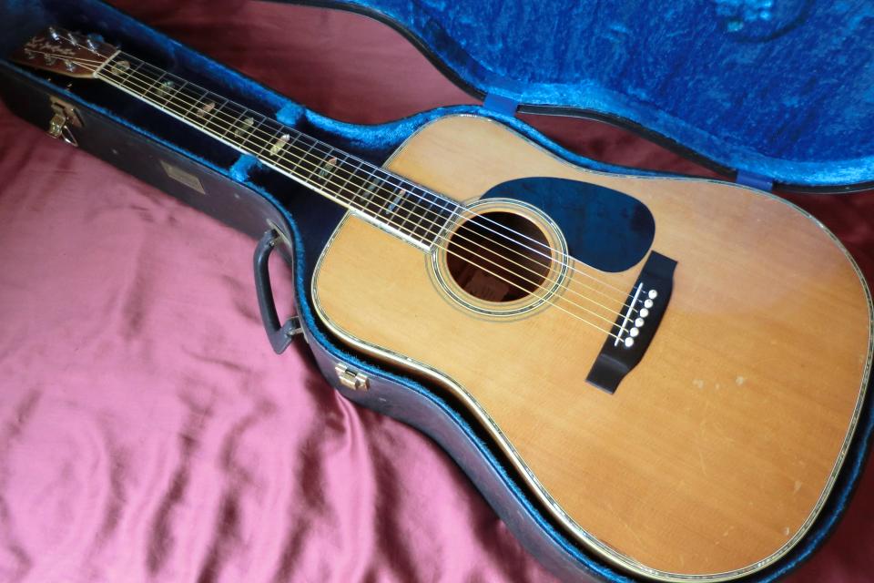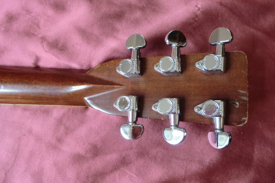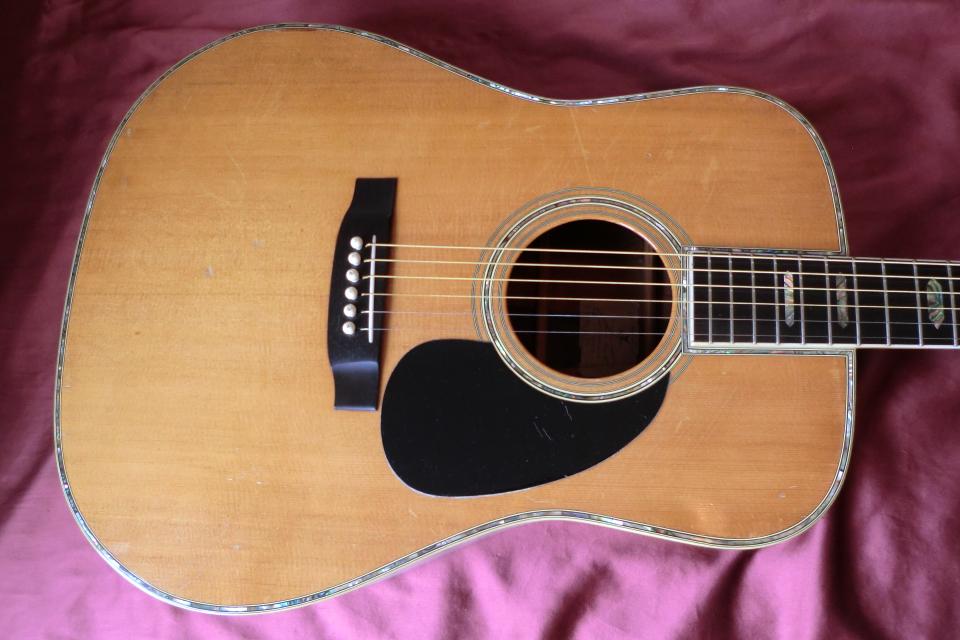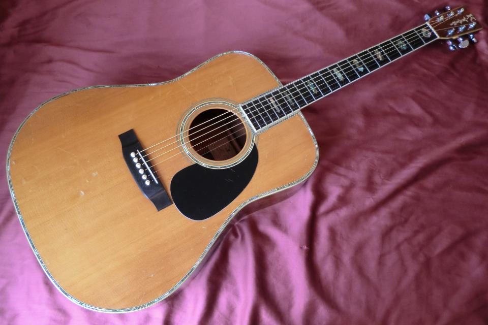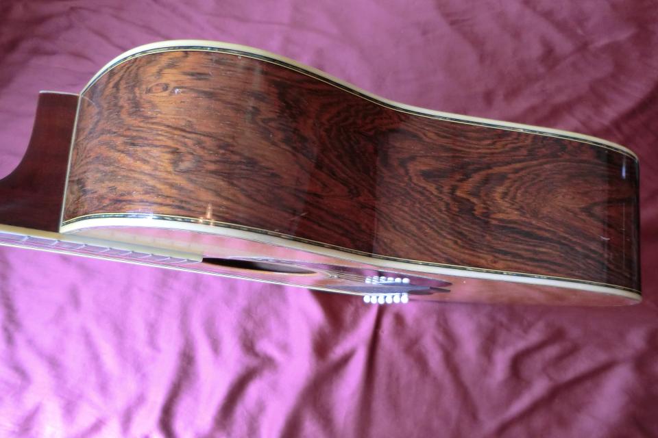 1977年製 K.Yairi YW-1000 になります。スプルース単板トップで、合板ながらハカランダのサイド&バック、エボニー指板。キズ、打痕はそれなり多いですが、ネックはほぼ真っ直ぐ、フレットはすり合わせ済みの7分山、サドルはぎりぎりまで削って低い状態ですが、弦高は12Fで6弦側が2.2mm、1弦側が2mmと非常に低くて弾きやすい状態です。出音は、非常に抜けのいいクリアなサウンドで、音の分離もよく、コード弾きもアルペジオもどちらもいい感じです。ケースは、ヤマハのハードケースがつきます。詳細はお問合せ下さい。