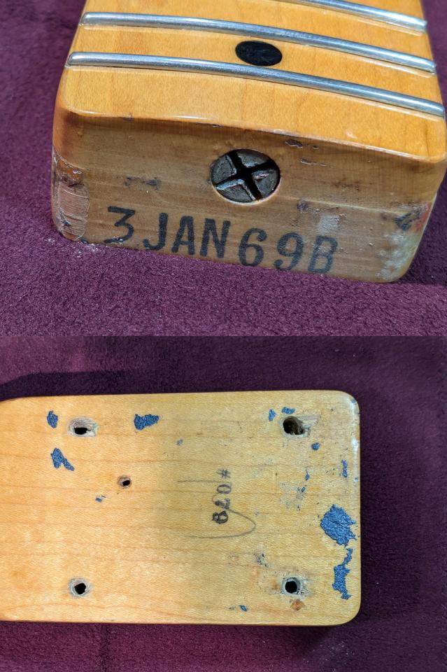 アルダーボディーに、メイプルネック/指板の1本。ボディカラーは大阪に拠点を構え、ヴィンテージ通も唸らせるリペア、製作工房の"八弦小唄"にてフィエスタレッドにリフィニッシュ、エイジドが施されて雰囲気のある外観になっております。ネックデイト69年、ボディはリフィニッシュされておりますが形状等から同年頃と思われます。ピックアップにはリアが69年デイト(リワウンド)、フロントは同年代の物が搭載。