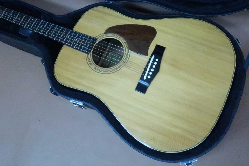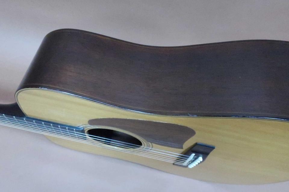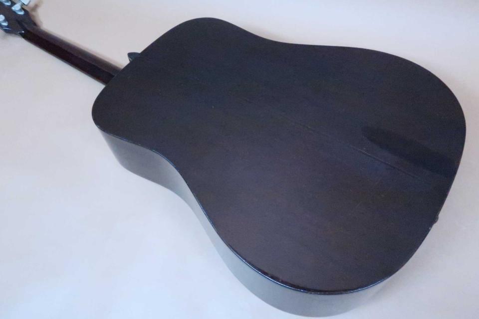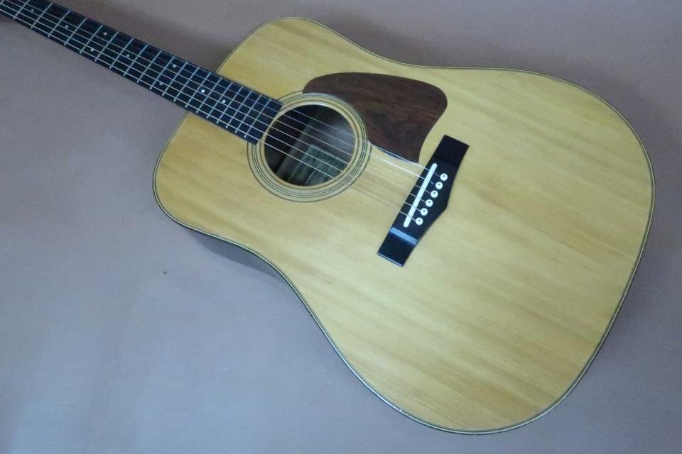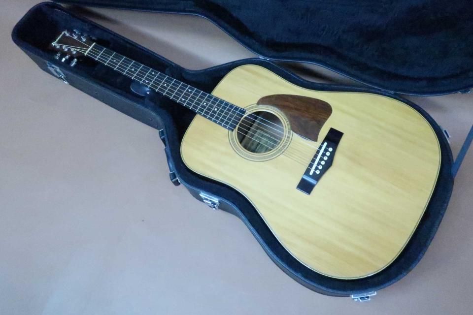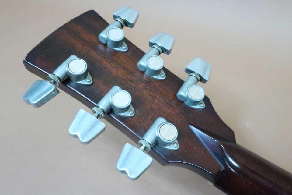 サウンドはスキャロップ・ブレイシングの奥行きのある箱鳴りする低域と弾き込まれた粒立ちの良い軽快な音抜けする中域に、煌びやかで艶やかに響くマホガニー特有の高音域も魅力です。弾き語りの伴奏やキレの良いバッキングなど近年物では味わえない深みのある優しくも切れ味の良い鳴りはオススメです。状態は年代相応の使用感は見られトップのピックガード上部に線傷と小さな打コンが点在しておりますが、パッと見た感じでは目立つダメージは見受けられません。サイドも擦り傷や小さな打コンが見られバックは右下にクラック修理が有り内部からもパッチ処理が施され強度やサウンドには影響は無く擦り傷などのバックル傷などが見られ使用感が強めです。ネック裏はコツコツと打コンが見られますがネックの反りや元起も見受けられず弦高も低くセッティングされ弾きやすく演奏性は問題ありません。フレットはローフレットでも8分目ぐらいは残っており極端な凹みは見られず、ナットはオイル漬けの牛骨にアップグレードされブリッジピンも交換されております。その他、ペグやエンドピン、ピックガードなどはオリジナル・コンディションを保っております。ナット幅約43mm、弦長約645mm弦高も12F6弦で約2.3mm、1弦約1.8mm、サドル中央の余裕も若干ありネックを含めプレイヤビリティも良好です。汎用のハードケース付きです。使用感は有りますが、弾き込まれた鳴りの良いプレイヤーにお勧めのジャパン・ヴィンテージです。中古市場でも滅多に出ない希少モデルです。是非この機会にお試しを頂ければ幸いです。