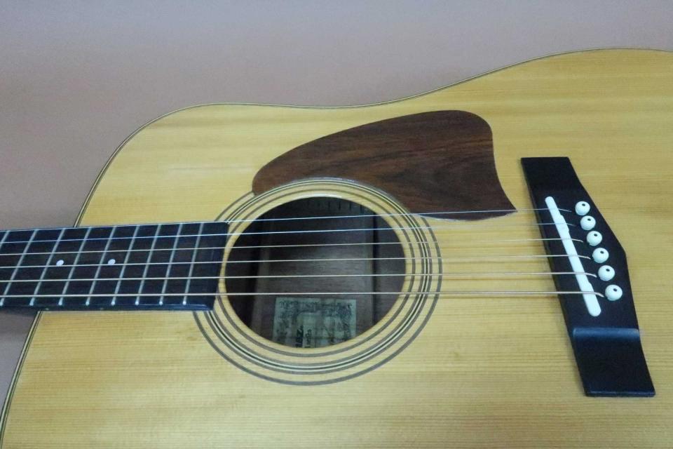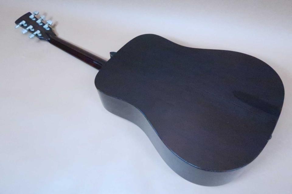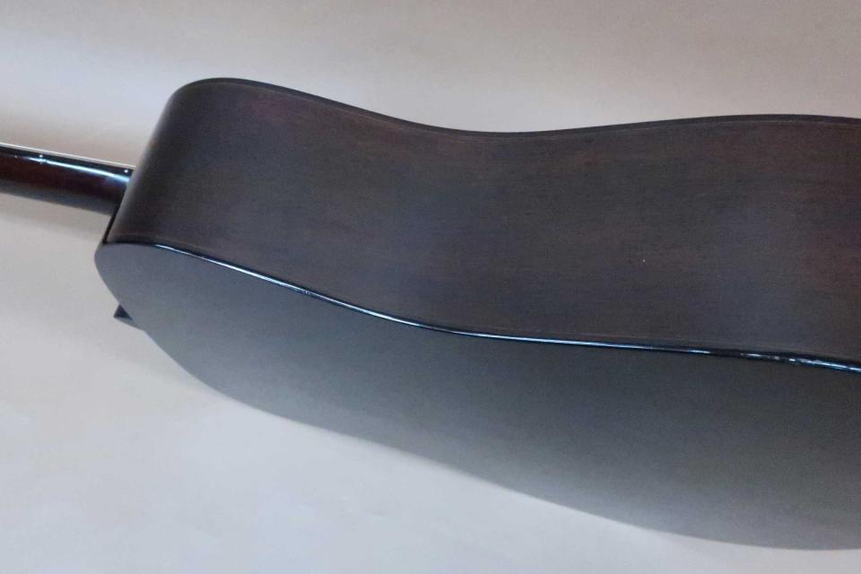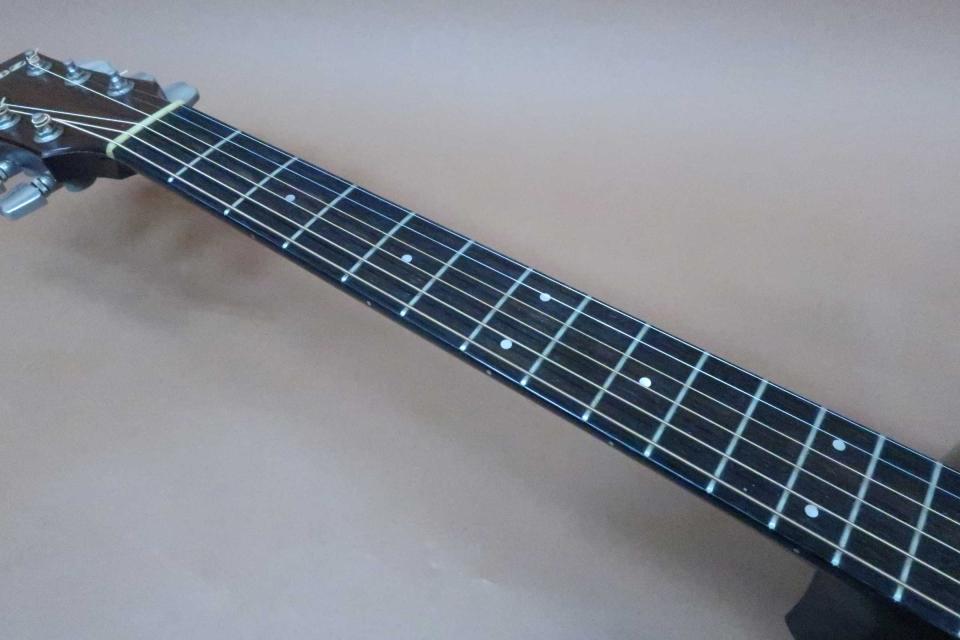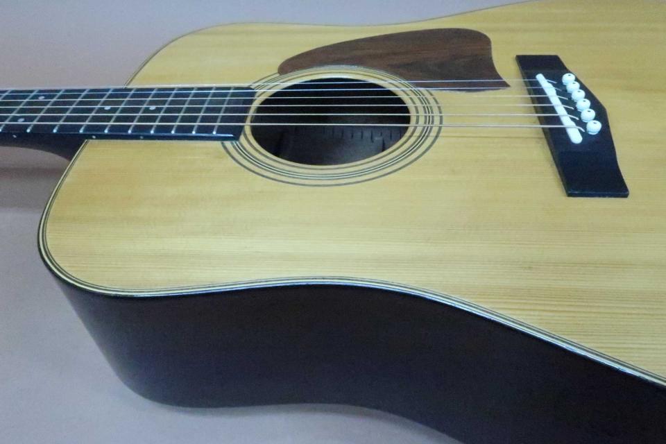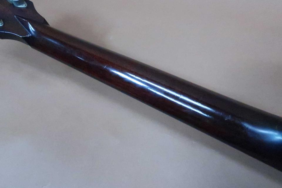 サウンドはスキャロップ・ブレイシングの奥行きのある箱鳴りする低域と弾き込まれた粒立ちの良い軽快な音抜けする中域に、煌びやかで艶やかに響くマホガニー特有の高音域も魅力です。弾き語りの伴奏やキレの良いバッキングなど近年物では味わえない深みのある優しくも切れ味の良い鳴りはオススメです。状態は年代相応の使用感は見られトップのピックガード上部に線傷と小さな打コンが点在しておりますが、パッと見た感じでは目立つダメージは見受けられません。サイドも擦り傷や小さな打コンが見られバックは右下にクラック修理が有り内部からもパッチ処理が施され強度やサウンドには影響は無く擦り傷などのバックル傷などが見られ使用感が強めです。ネック裏はコツコツと打コンが見られますがネックの反りや元起も見受けられず弦高も低くセッティングされ弾きやすく演奏性は問題ありません。フレットはローフレットでも8分目ぐらいは残っており極端な凹みは見られず、ナットはオイル漬けの牛骨にアップグレードされブリッジピンも交換されております。その他、ペグやエンドピン、ピックガードなどはオリジナル・コンディションを保っております。ナット幅約43mm、弦長約645mm弦高も12F6弦で約2.3mm、1弦約1.8mm、サドル中央の余裕も若干ありネックを含めプレイヤビリティも良好です。汎用のハードケース付きです。使用感は有りますが、弾き込まれた鳴りの良いプレイヤーにお勧めのジャパン・ヴィンテージです。中古市場でも滅多に出ない希少モデルです。是非この機会にお試しを頂ければ幸いです。