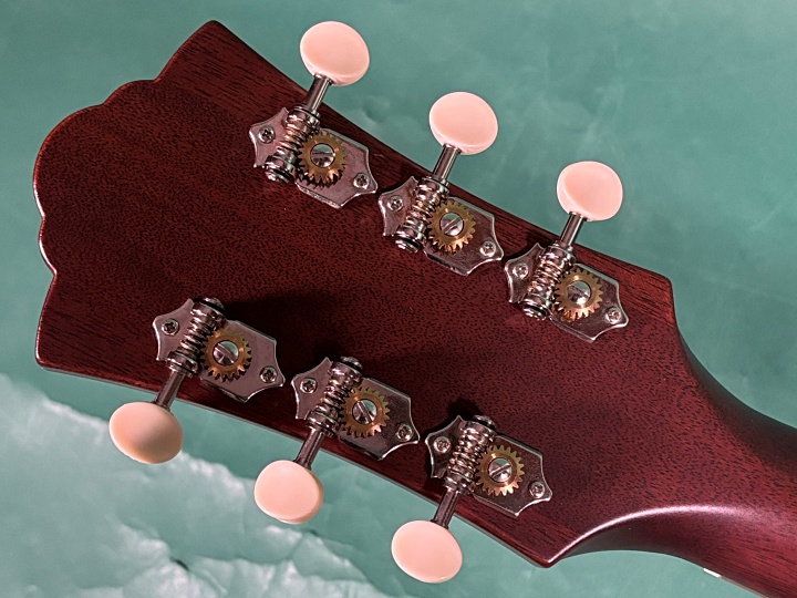 F-40は1954年から1983年まで生産されていたジャンボサイズモデル、ボディートップはソリッド・シトカ・スプルース、サイド、バックはアフリカン・マホガニーの単板、マホガニーネック、ローズウッド指板、ローズウッドのブリッジです。ペグはオープンバックの3対3ペグでチューニングもスムーズです。